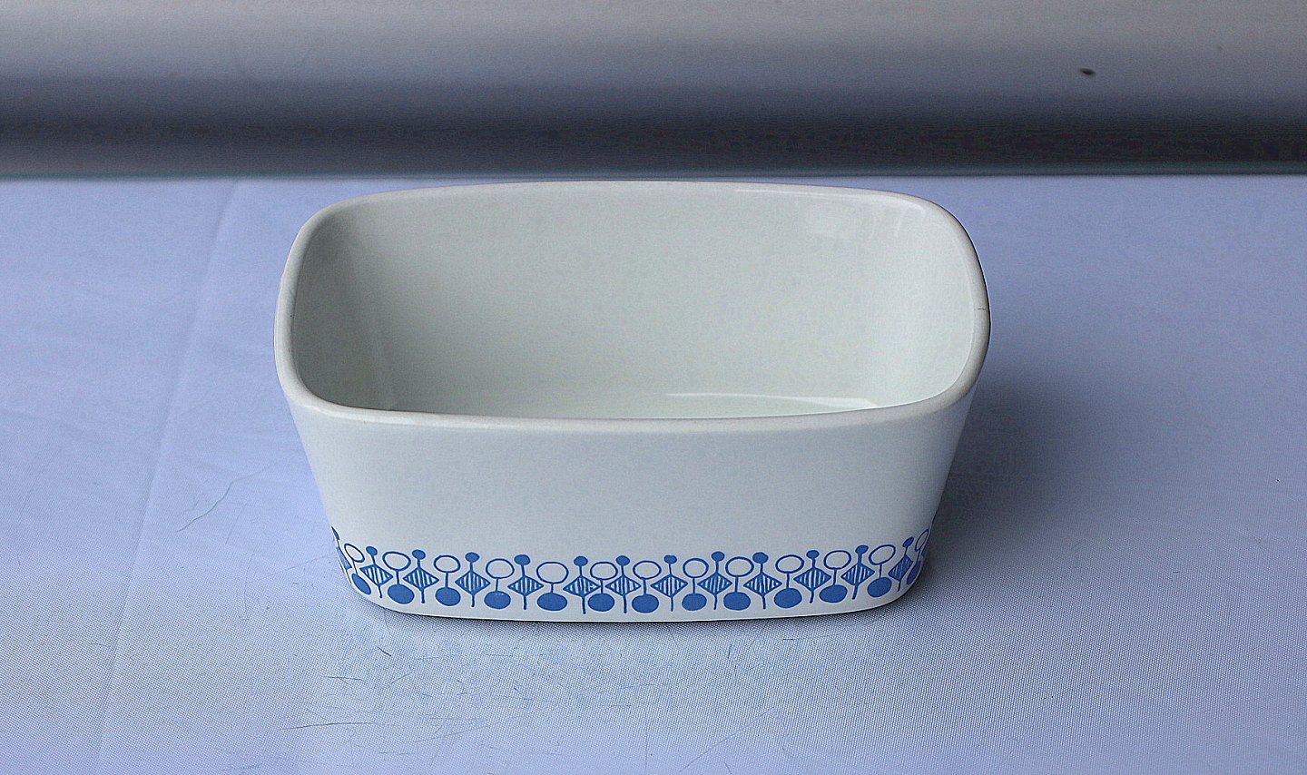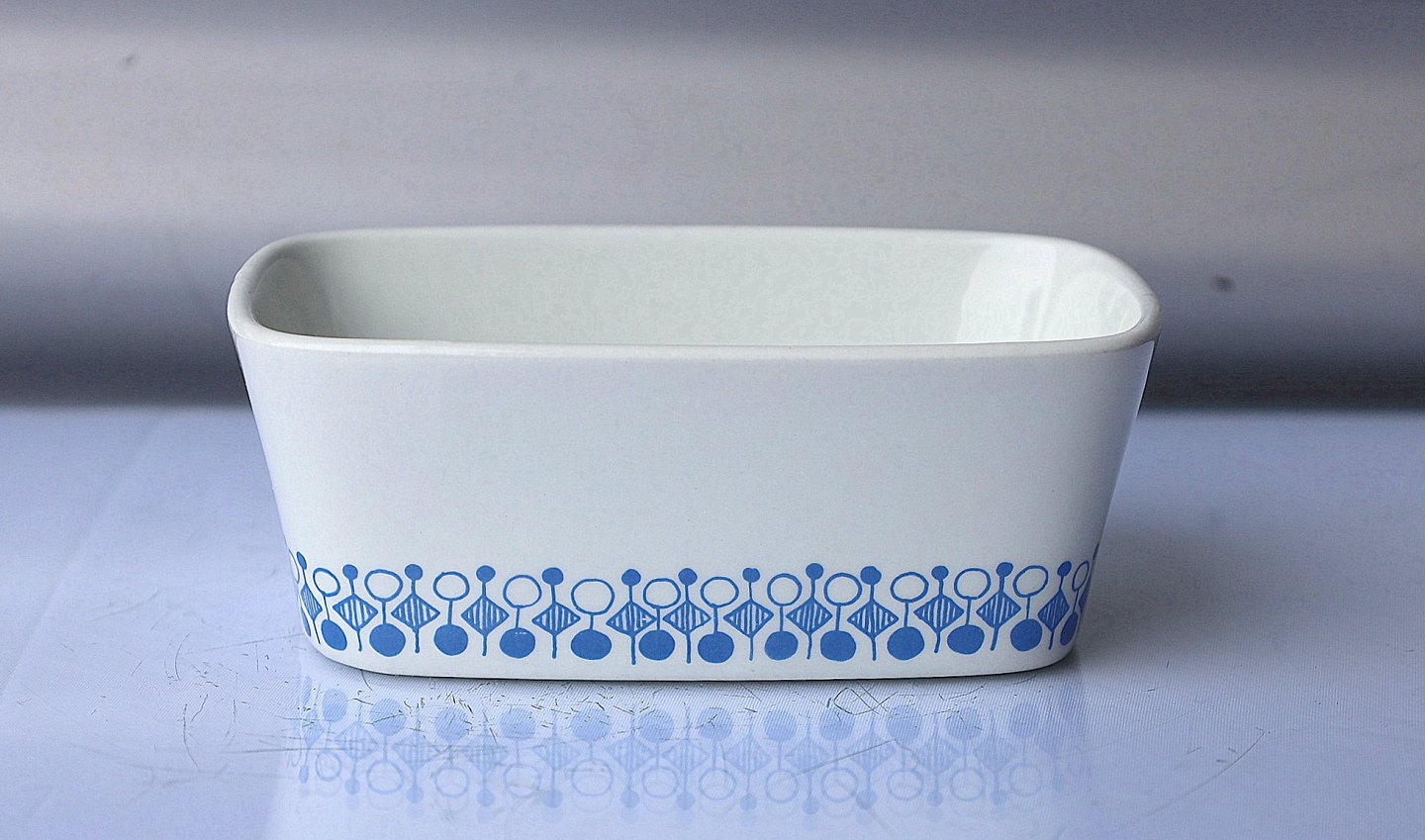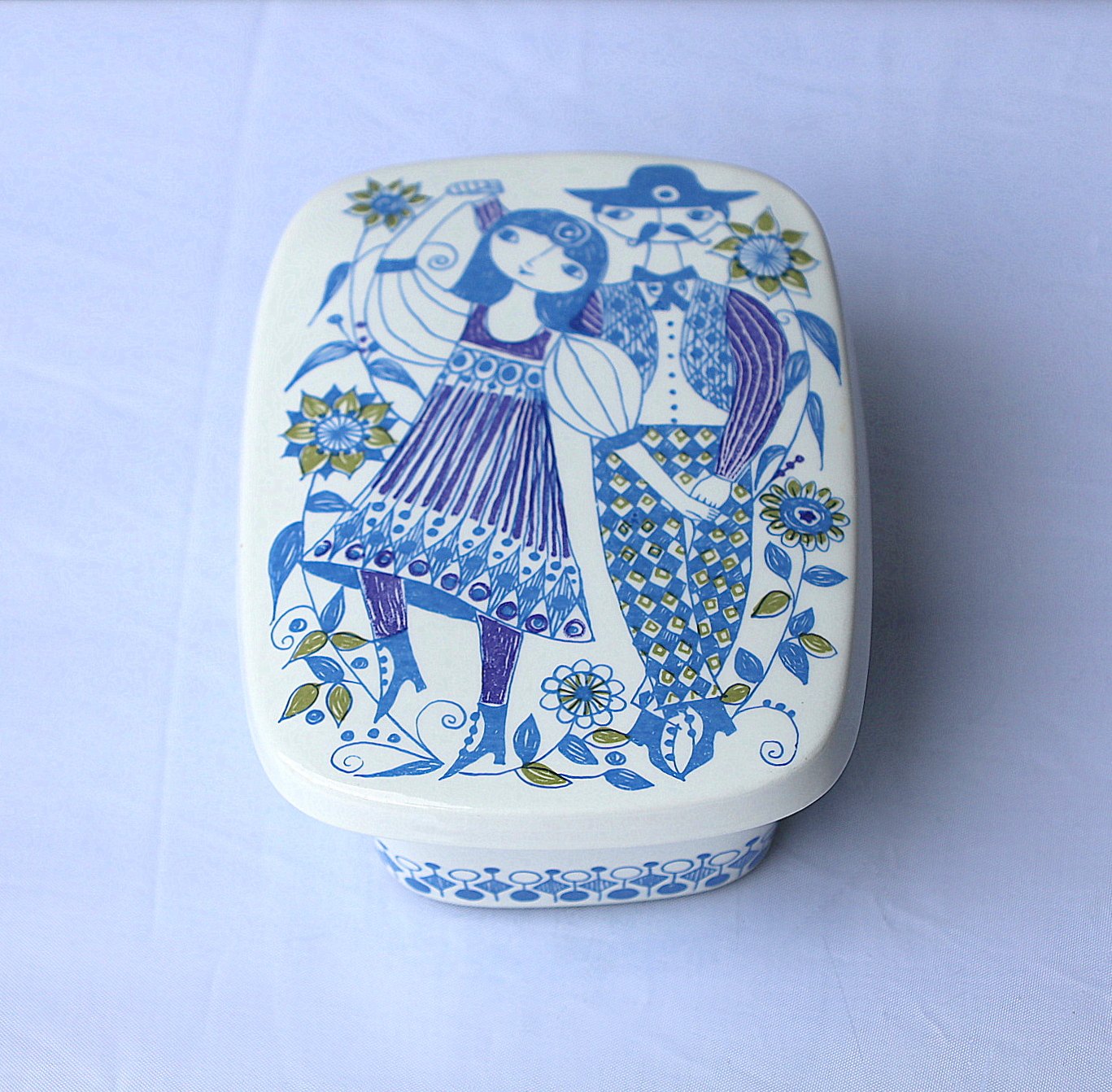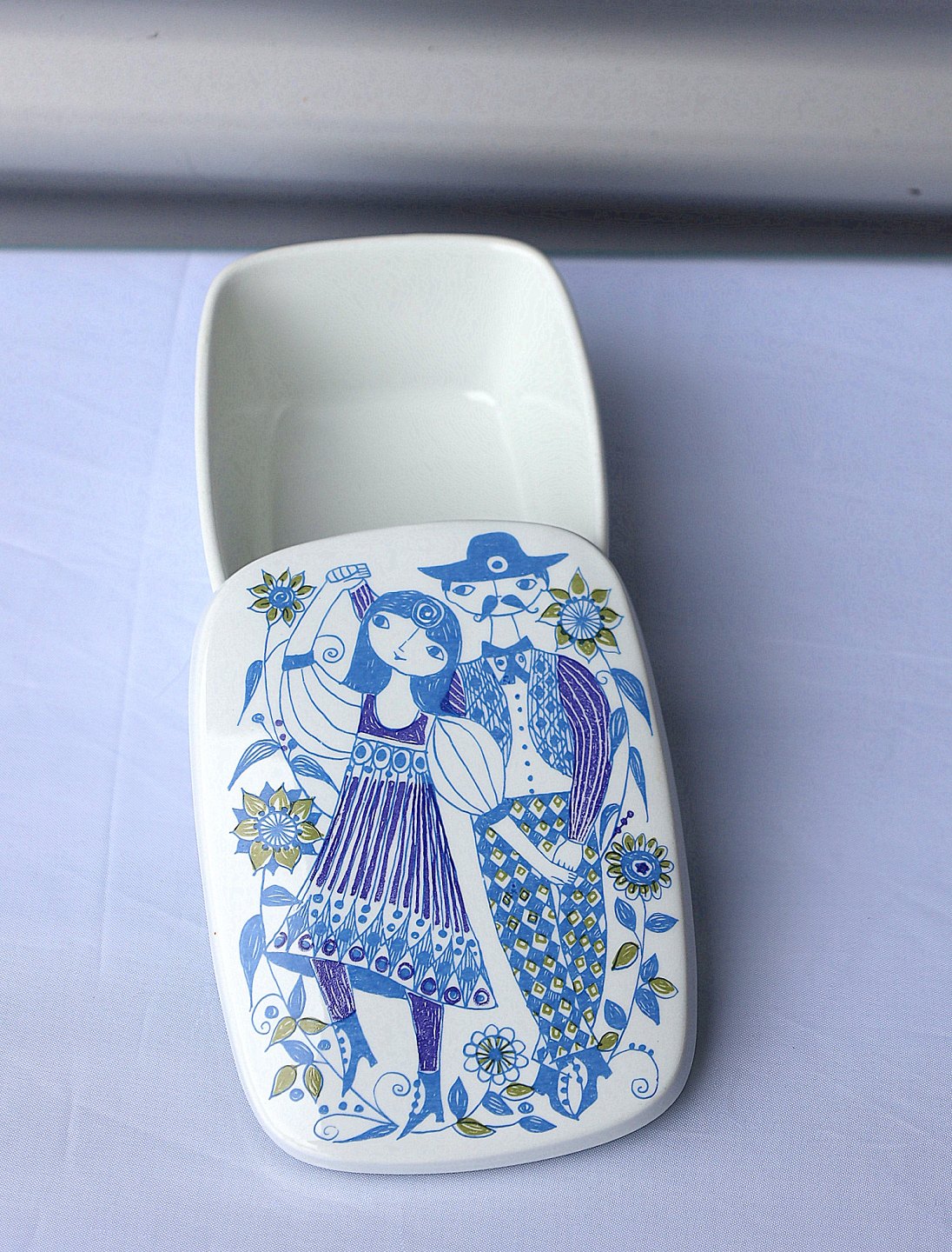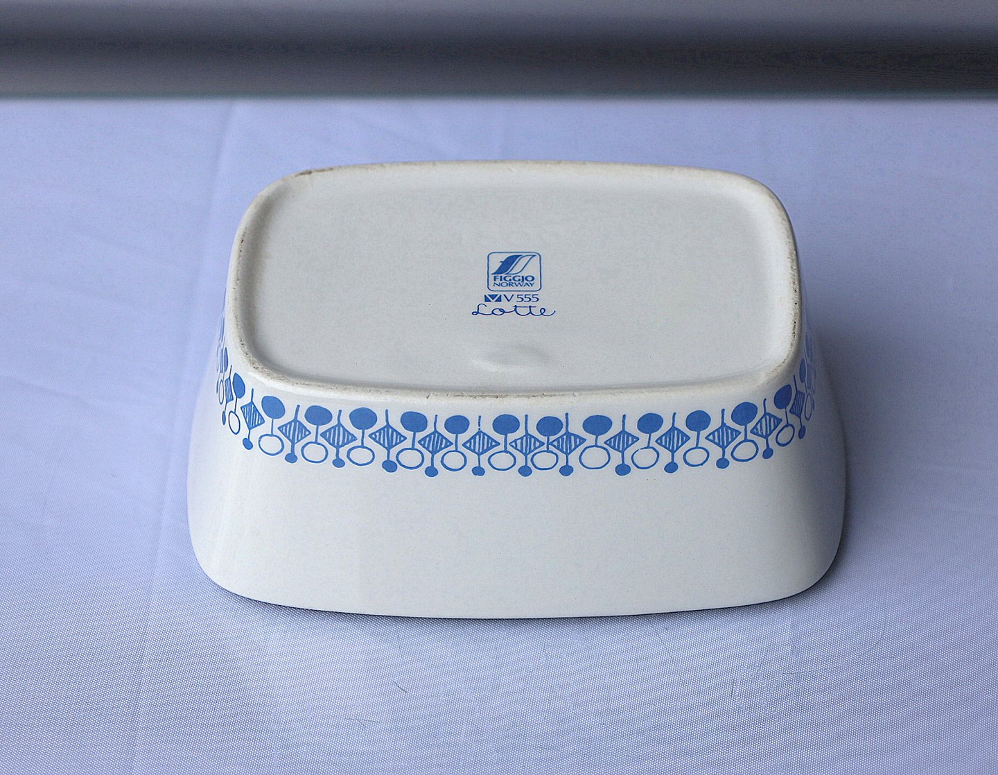 Figgjo, Norway. Smørboks, VV 555, Lotte. Smørboks, i hvid keramik, med tegning af "Lotte" på låget. Smørboksen har blå bort, nederst.