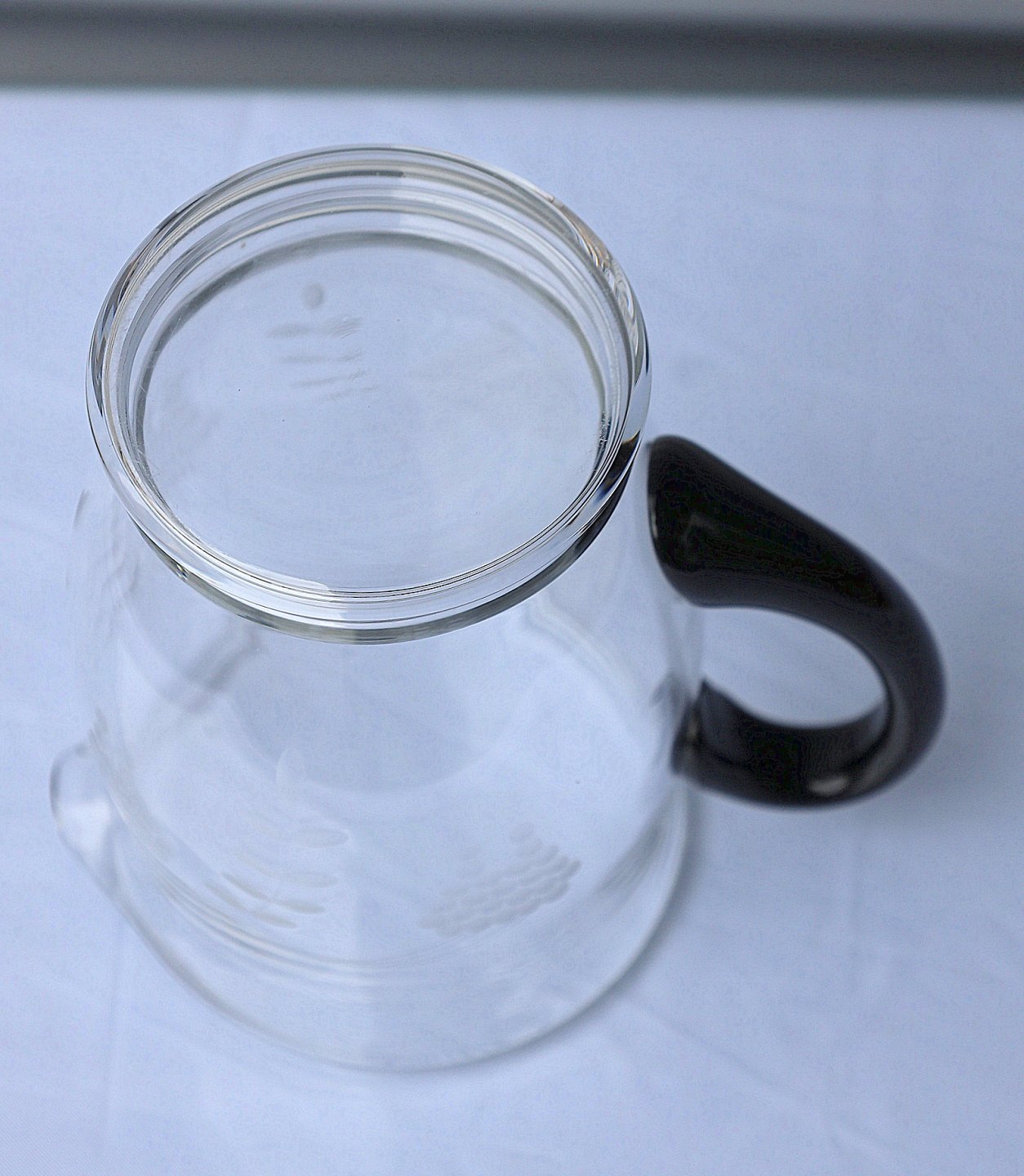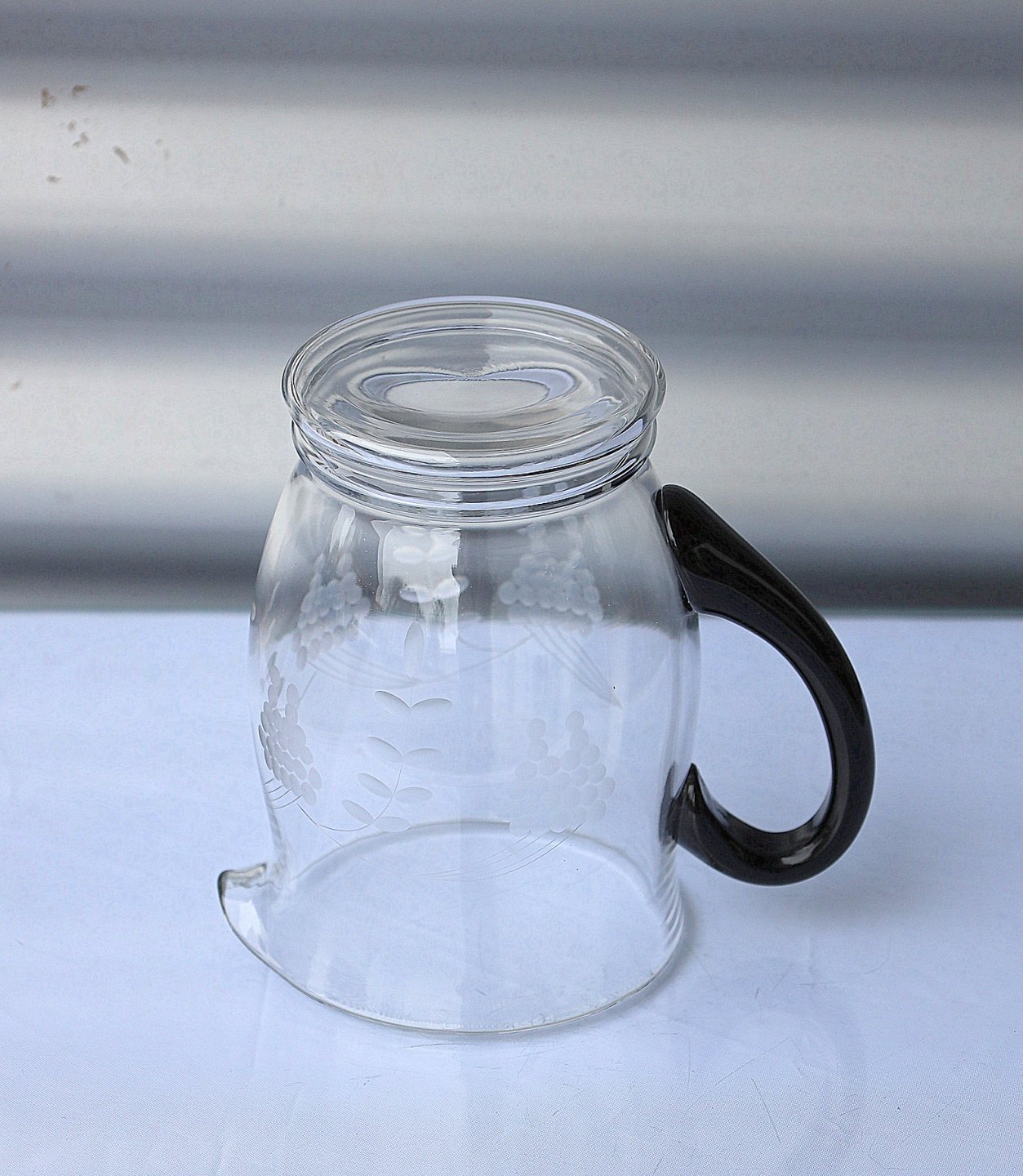 Holmegaard Glasværk. Juno kande med sort hank. Glaskande med slebet mønster med blomst og sort, påsat hank, hanken er af sort opalglas.