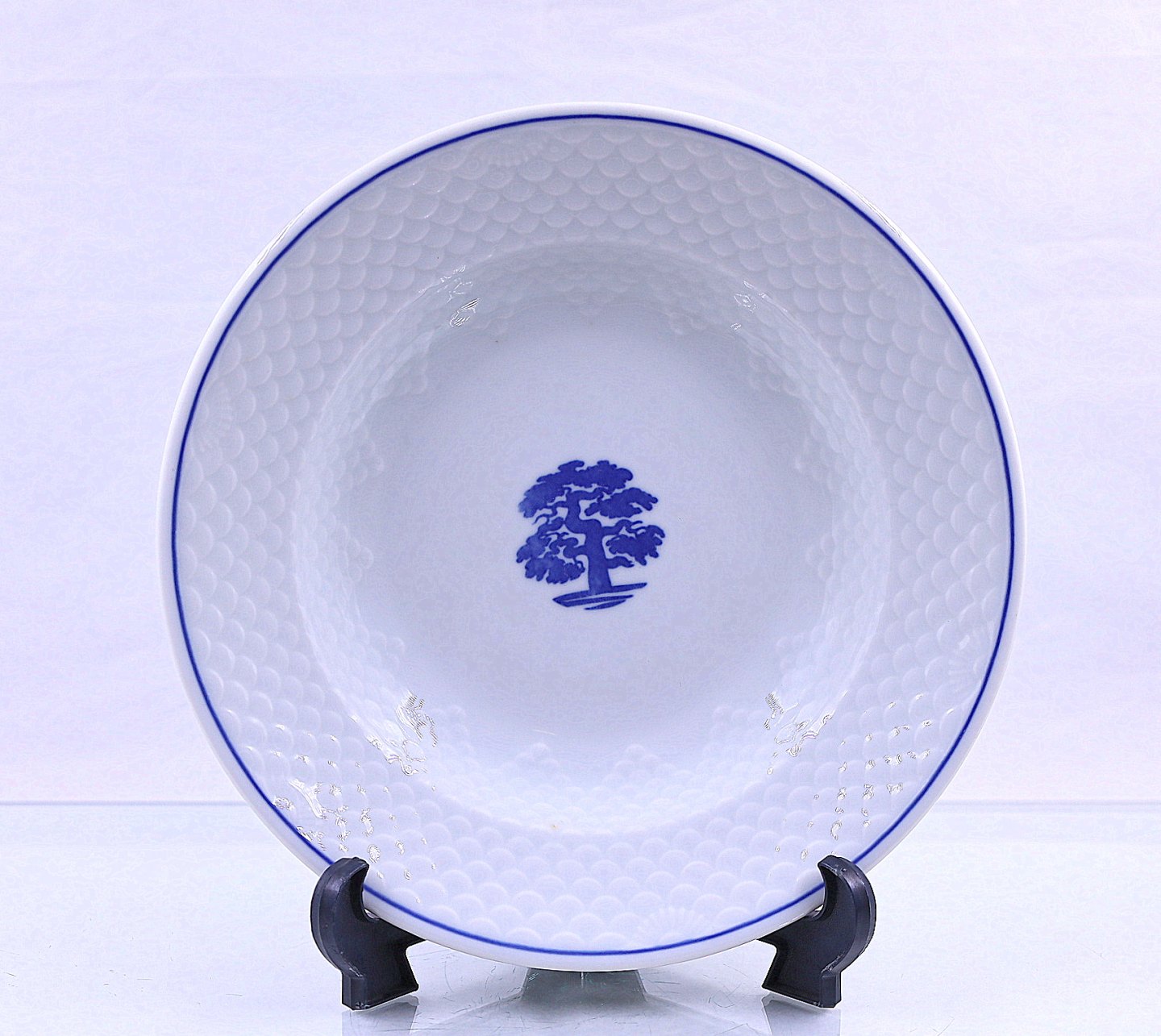 Bing & Grøndahl. Hotelporcelæn Egetræ, Grødtallerken nr. 710. Restaurants porcelæn, hvidt porcelæn med stiliseret, blåt, egetræ som dekoration.