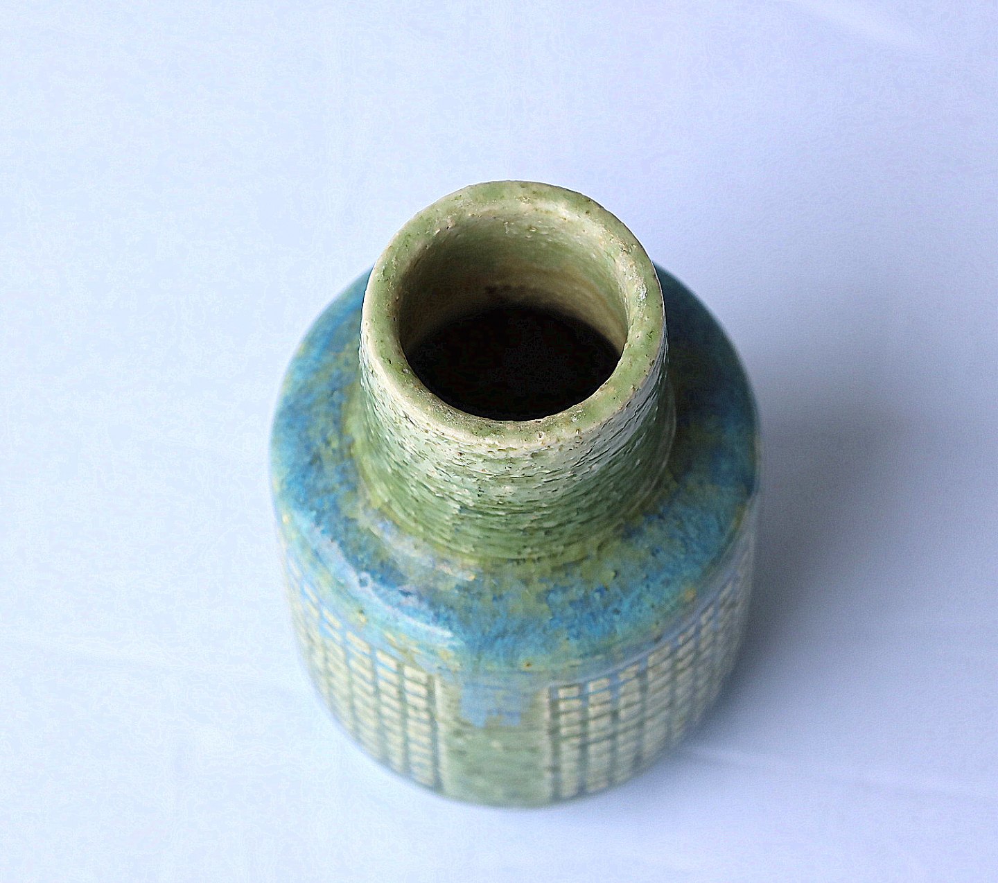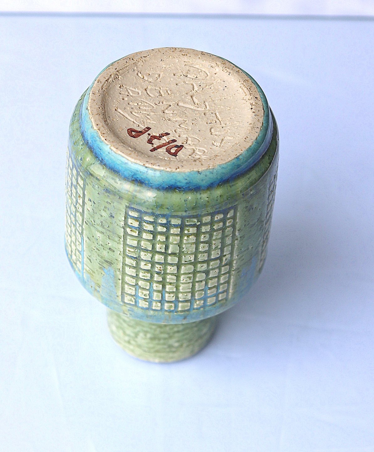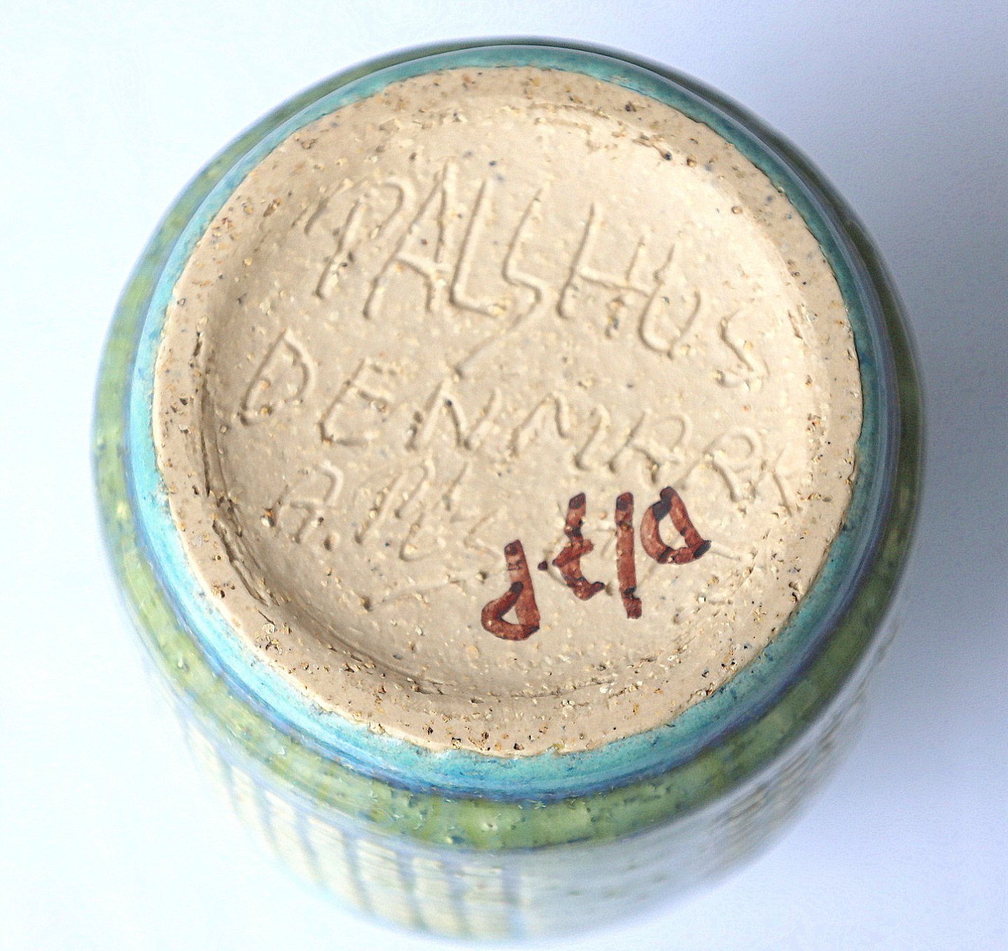 Palshus, grønlig, keramik vase. Vasen er søgrøn ,med 4 felter, med geometrisk.