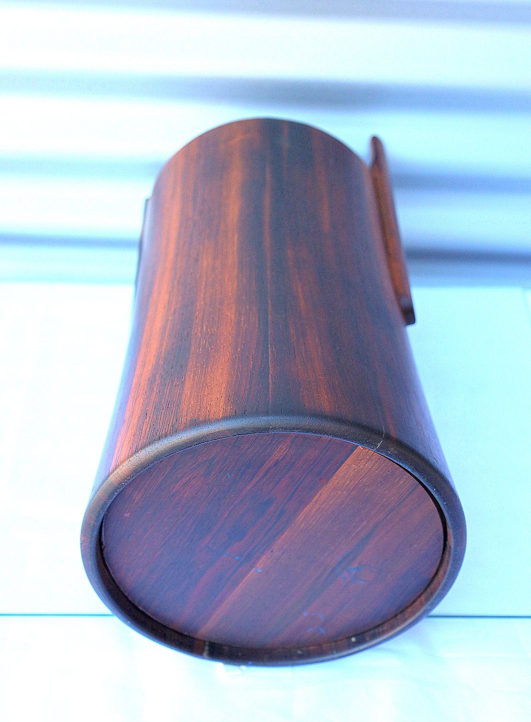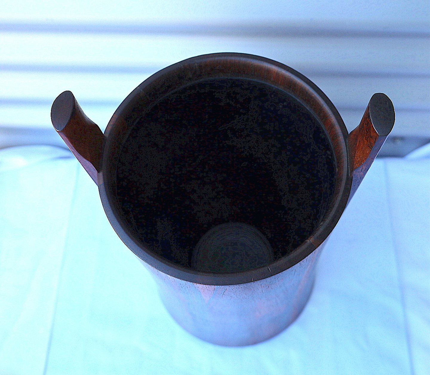 Jens Harald Quistgaard = IHQ. Isspand/ champagnekøler. Isspanden er lavet i Rio Palisander og fortet med plast og med påsatte hanke. Isspanden stammer fra bo efter tidligere direktør på Nissen og er formentlig en prototype.