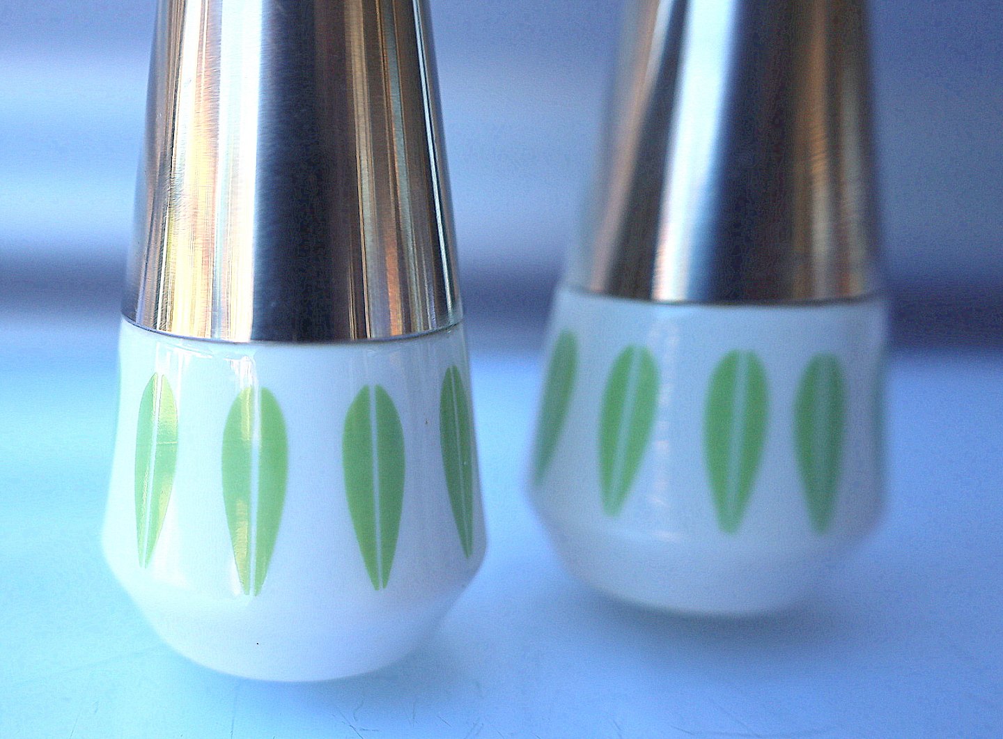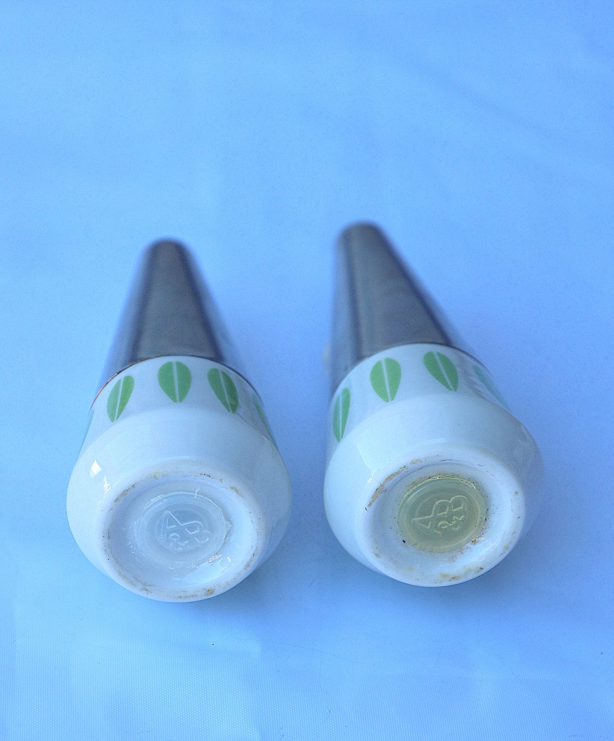 Lyngby Danild salt-og pebersæt, i Lotus- serien. Sættet er med top af stål og nederst, porcelæn med grøn Lotus dekoration.