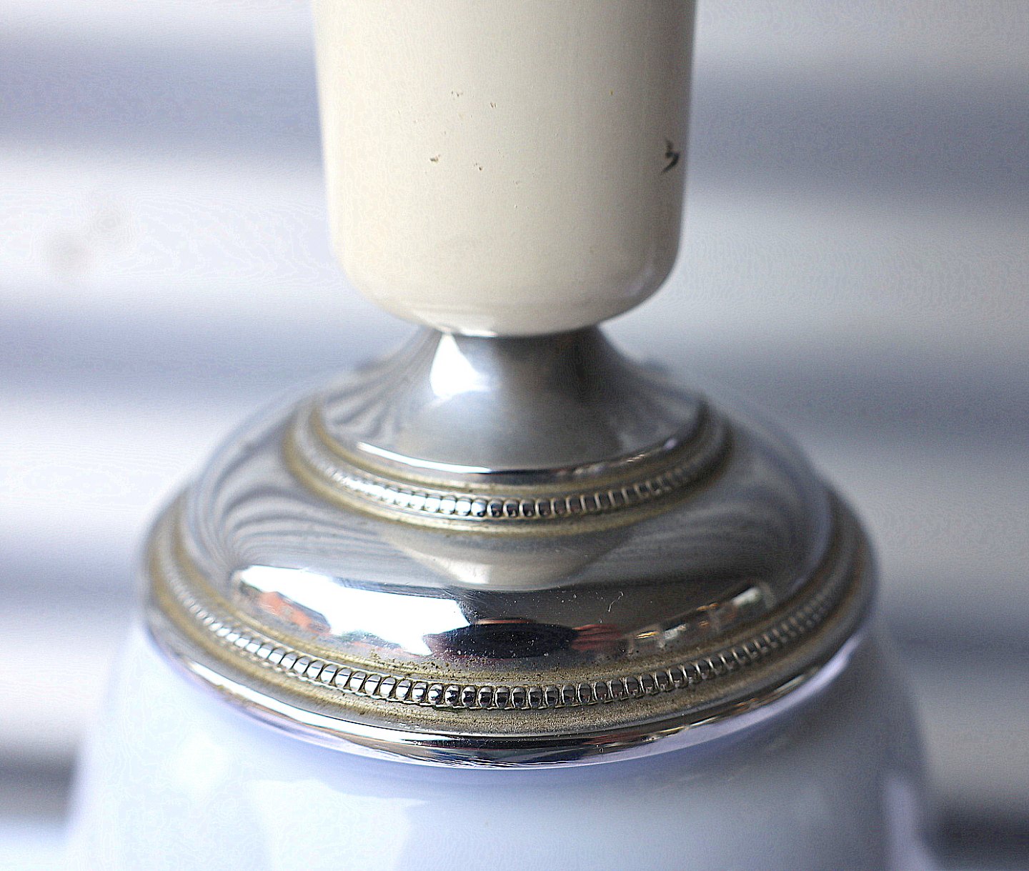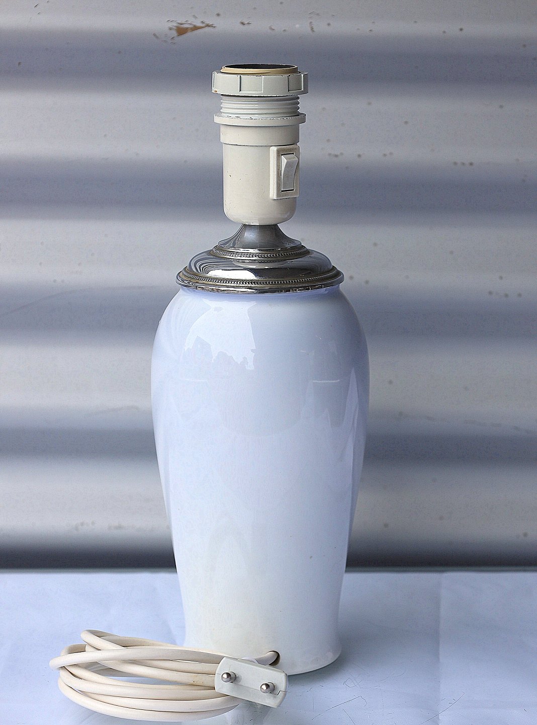 Bing & Grøndahl. Bordlampe nr. 8343/265.Dekoration på lampen er blå blomster med grønne blade. Fatningen er sat på med sølvlignende metal.