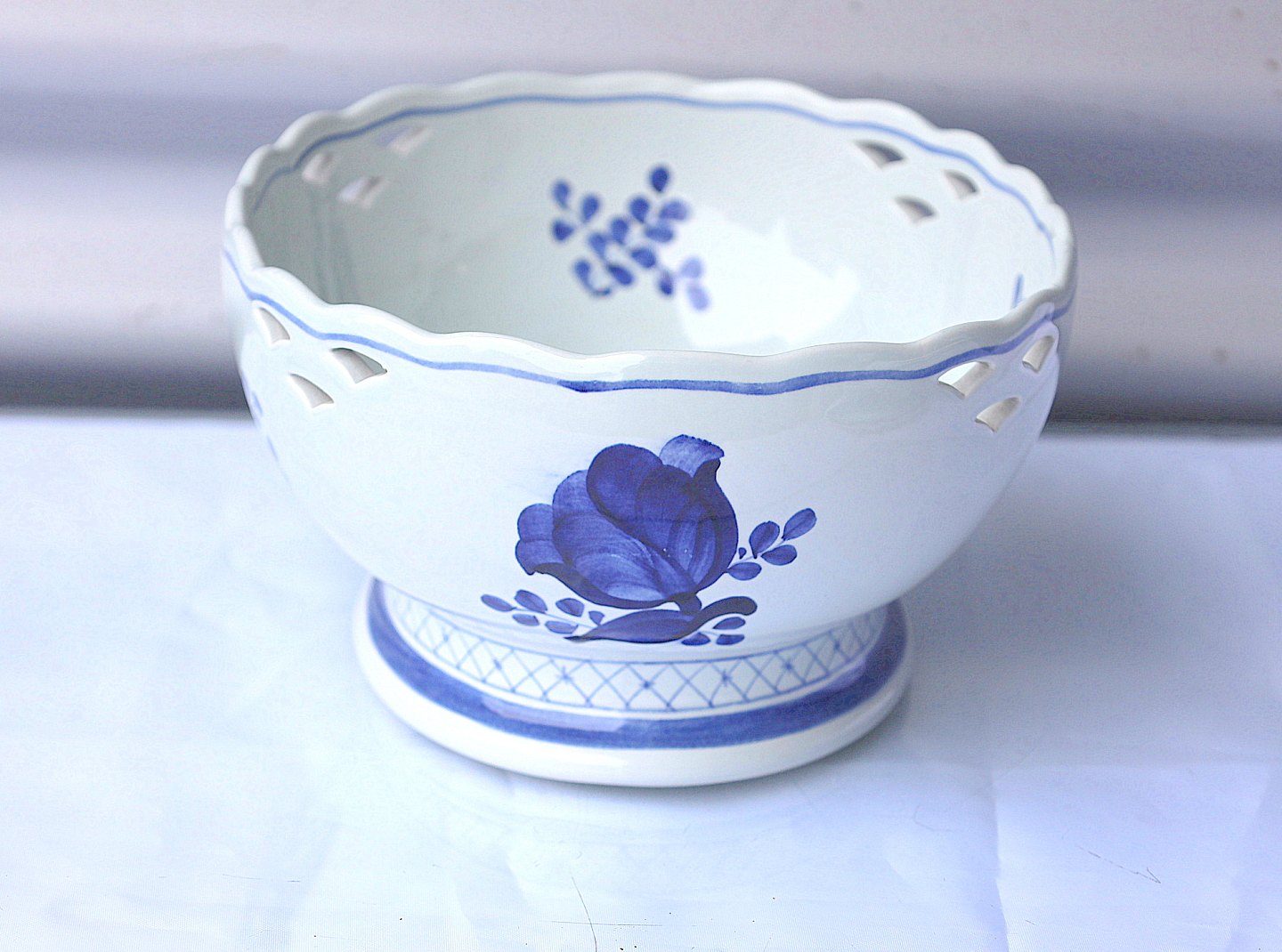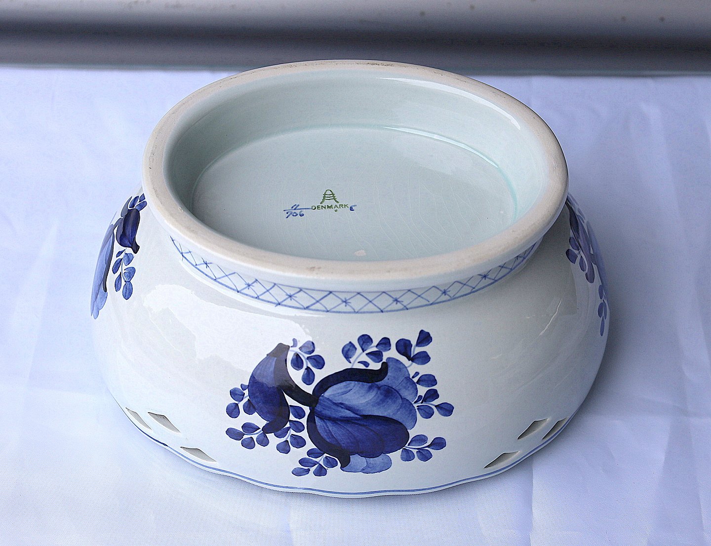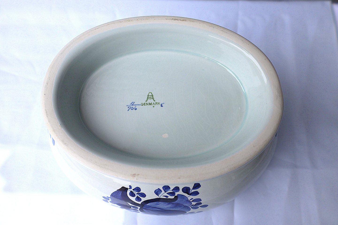 Aluminia Tranquebar, skål nr. 11/706. Oval skål, med blå dekoration og skålen er af fajance, på fod og gennembrudt kant