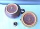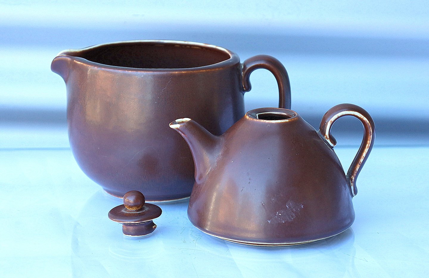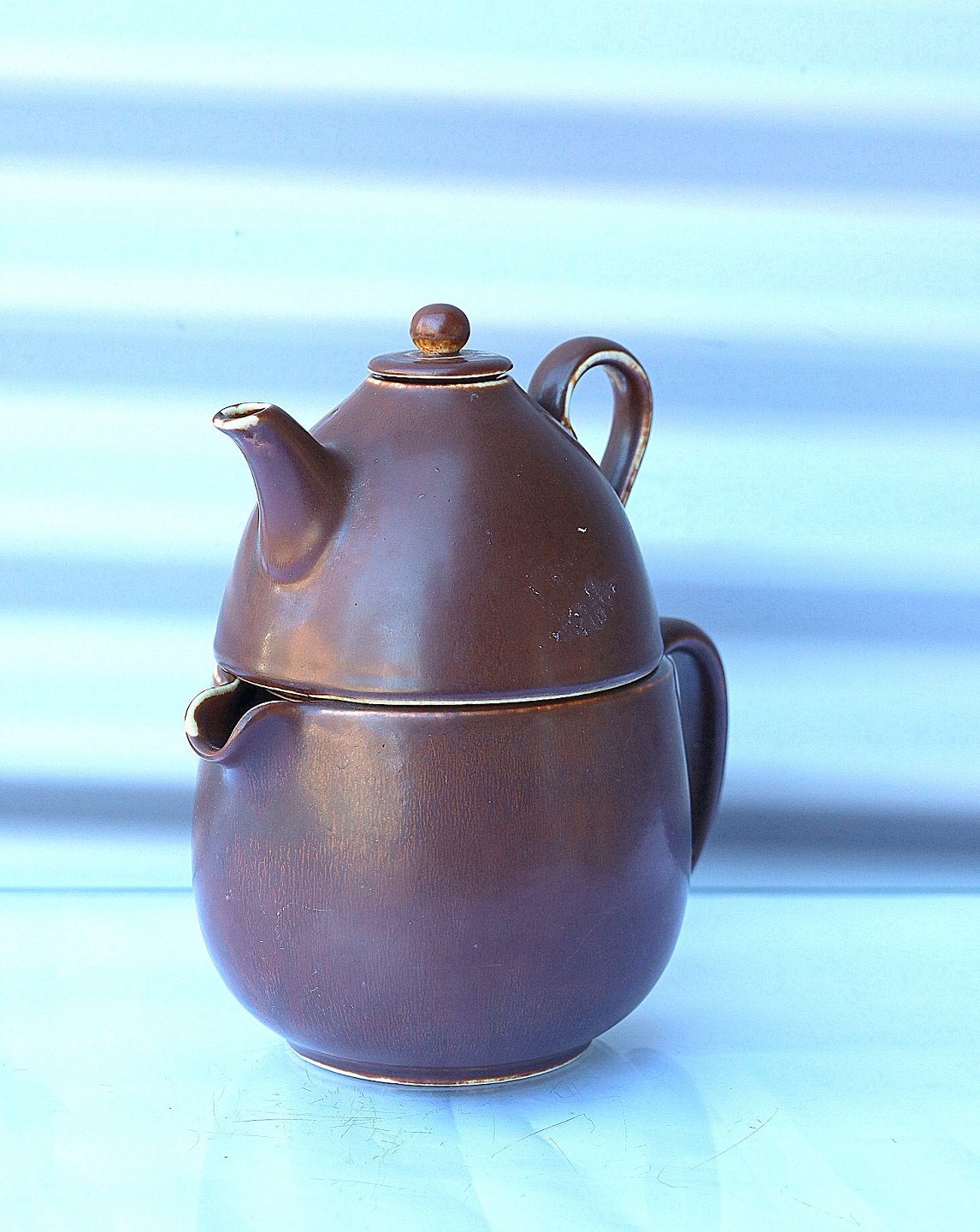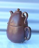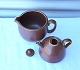 Rørstrand, Sweden. Gunnar Nylund, tekande/dobbeltkande. Sættet er af keramik oge i brune farver og består af en vandkande, nederst, og en tekande, øverst, tekanden har låg.