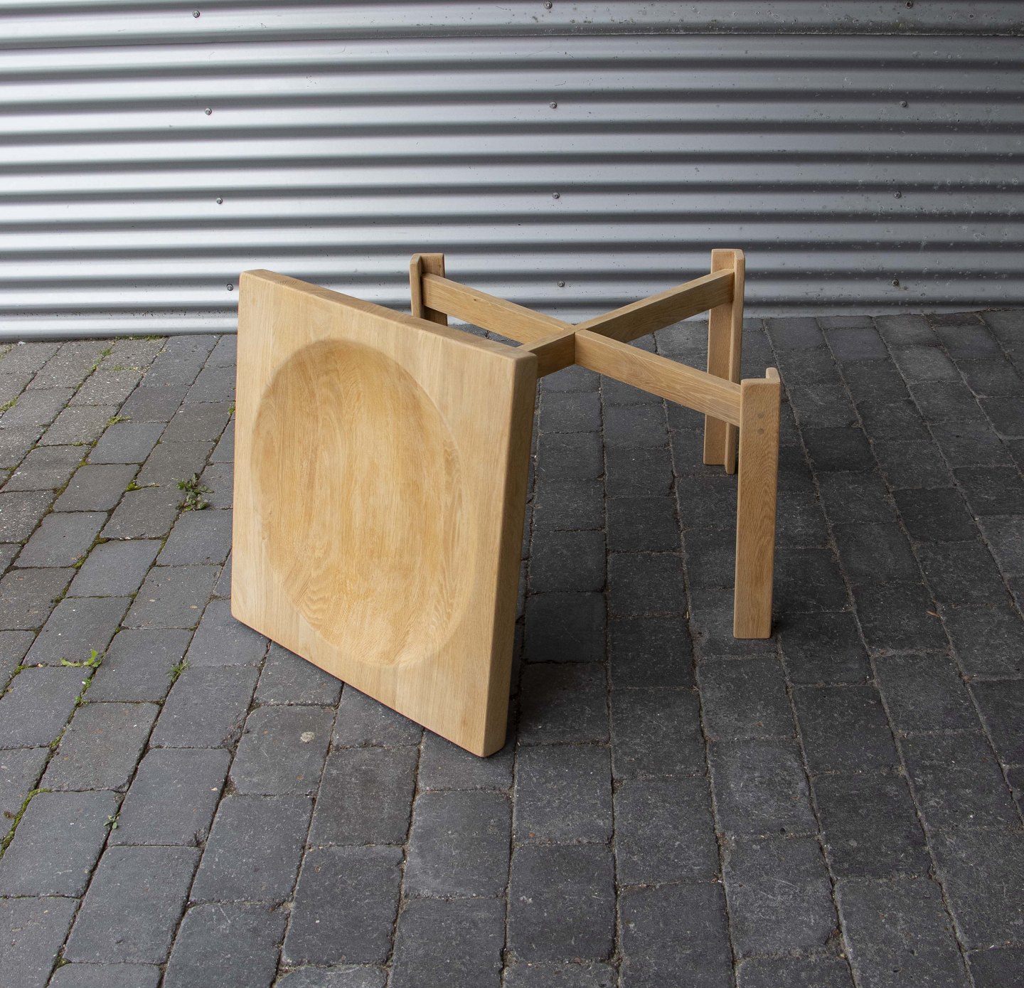 Bordpladen har en flad side og en side med en cirkelformet fordybning.