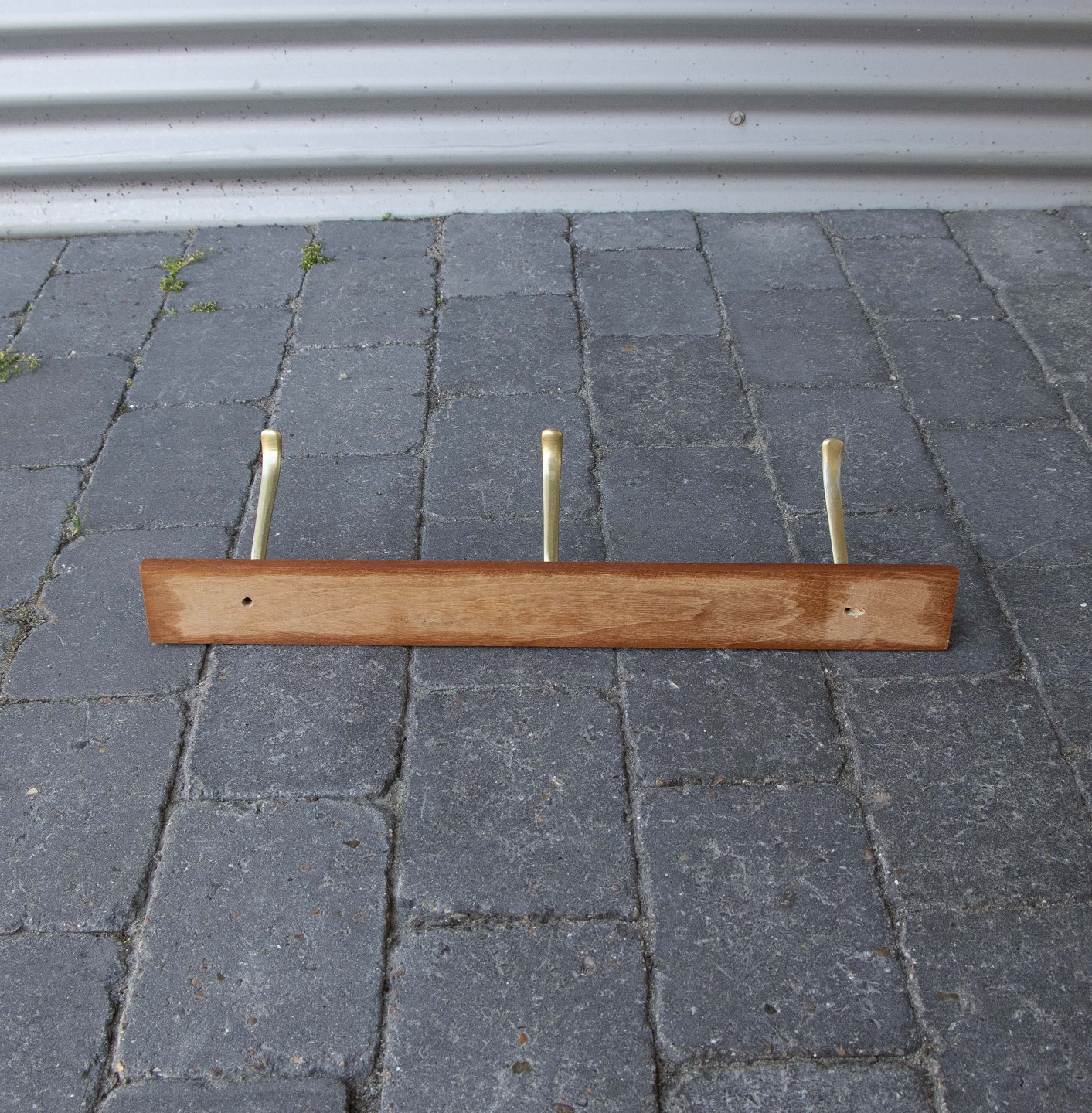 Knagerække med tre knager i gyldenbelagt metal på teaktræ