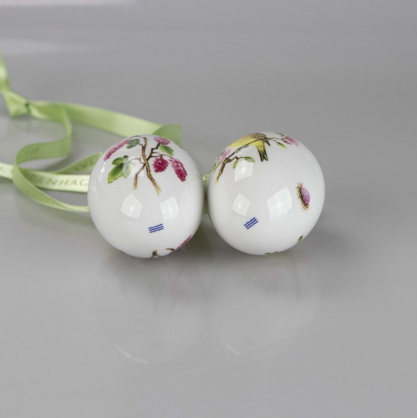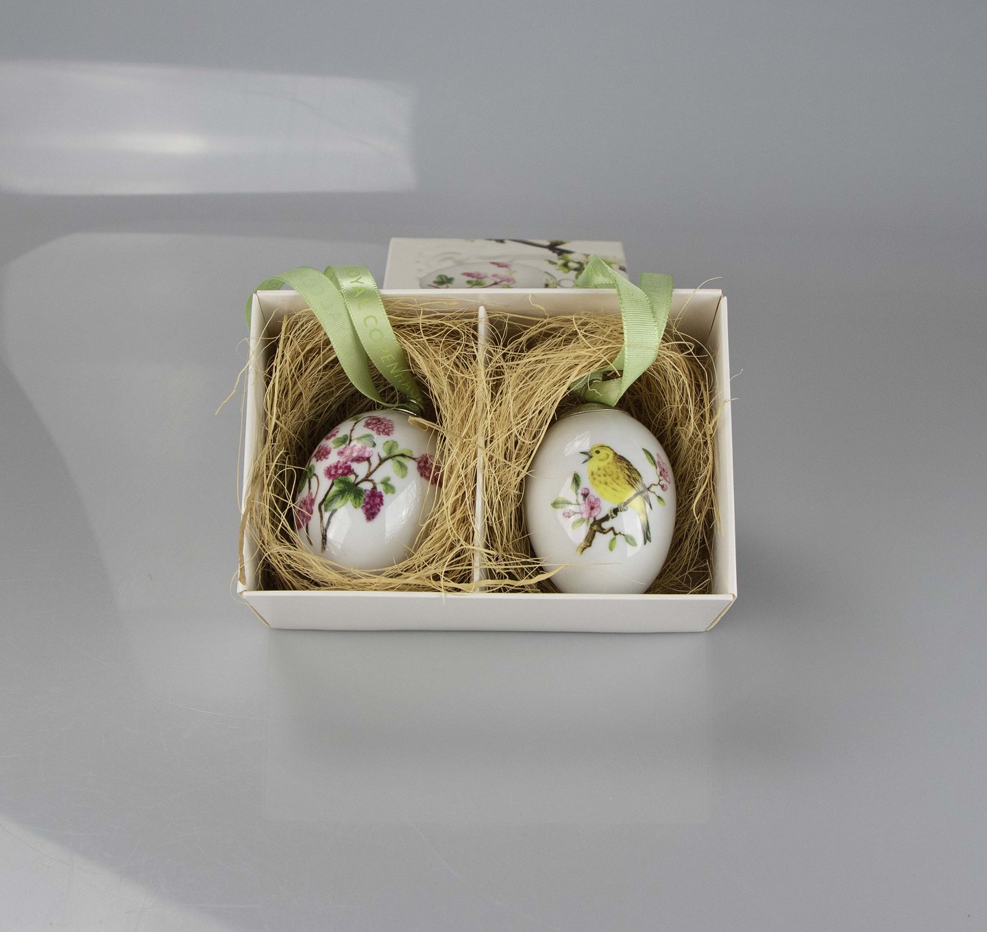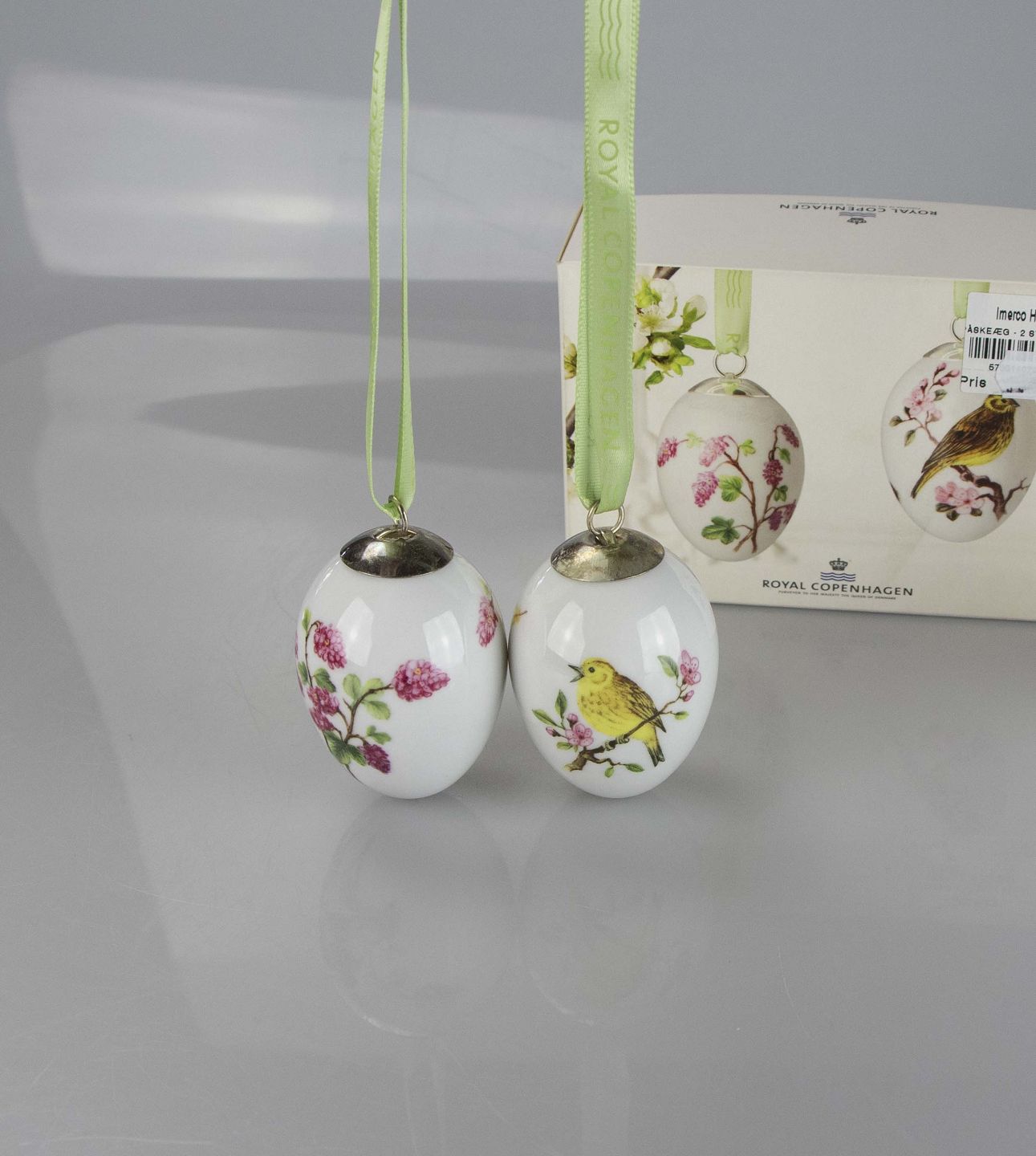 Et sæt påskeæg i porcelæn med motiv af rebis og gulspurv