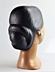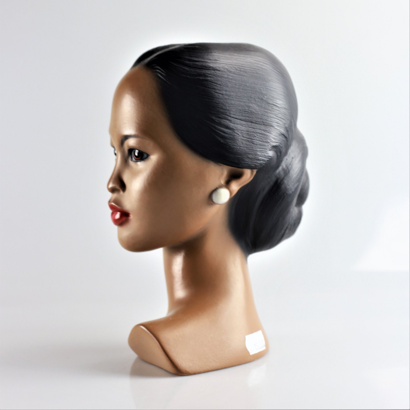 kvindehoved, kvinde med makeup, skulptur, hattebuste, sort hår