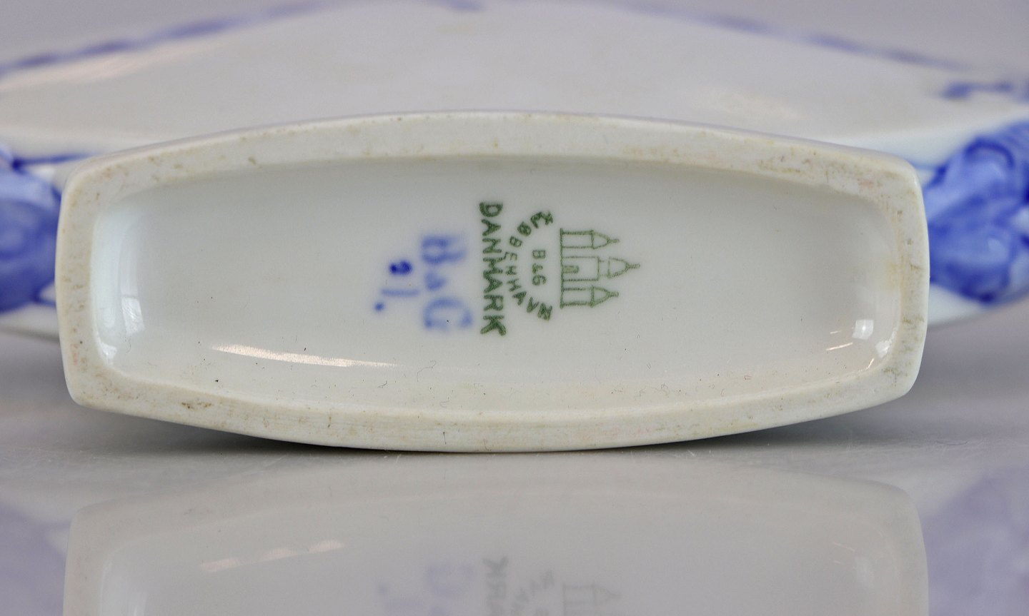 Vase i hvidt porcelæn med skelform og motiv af guirlander med blå blomster