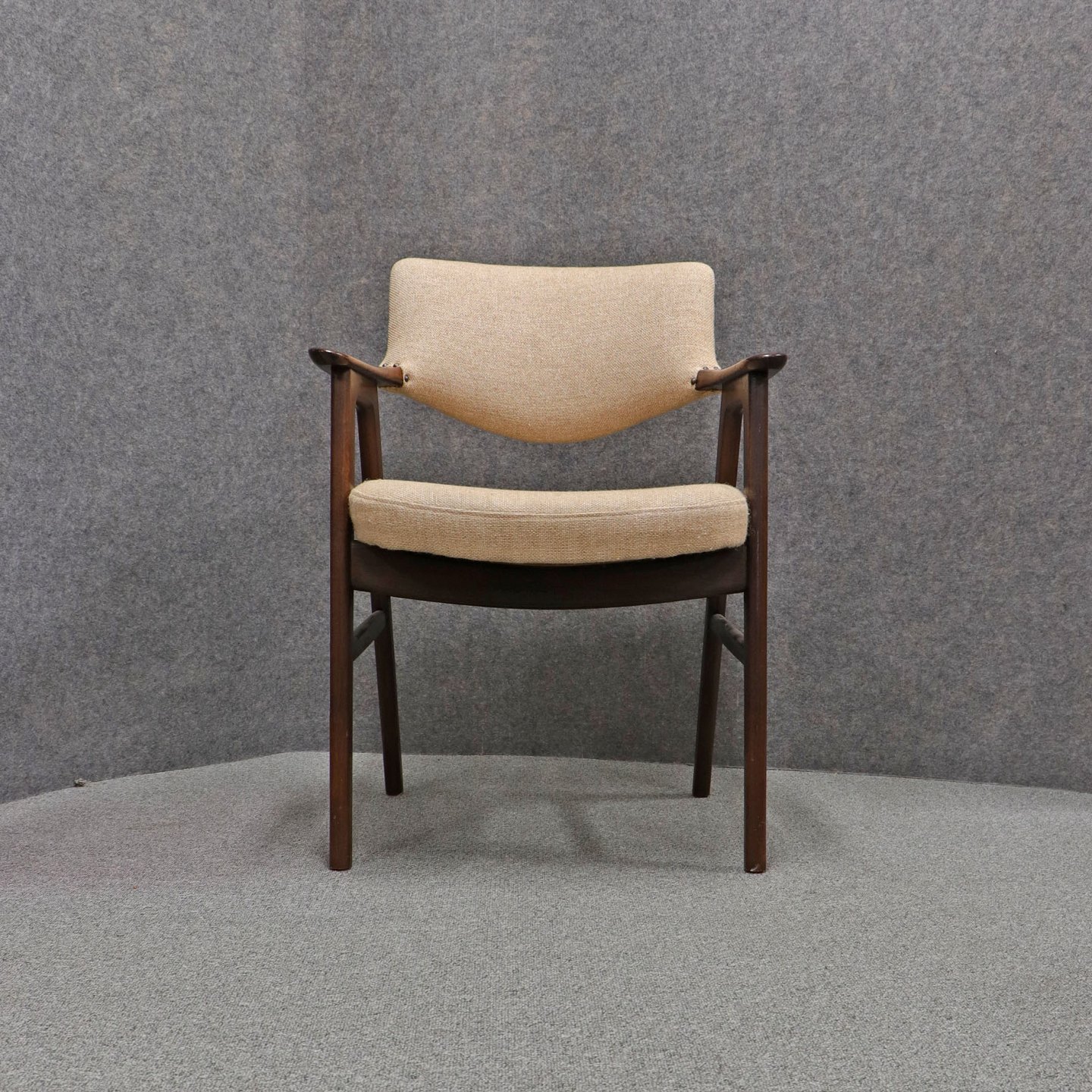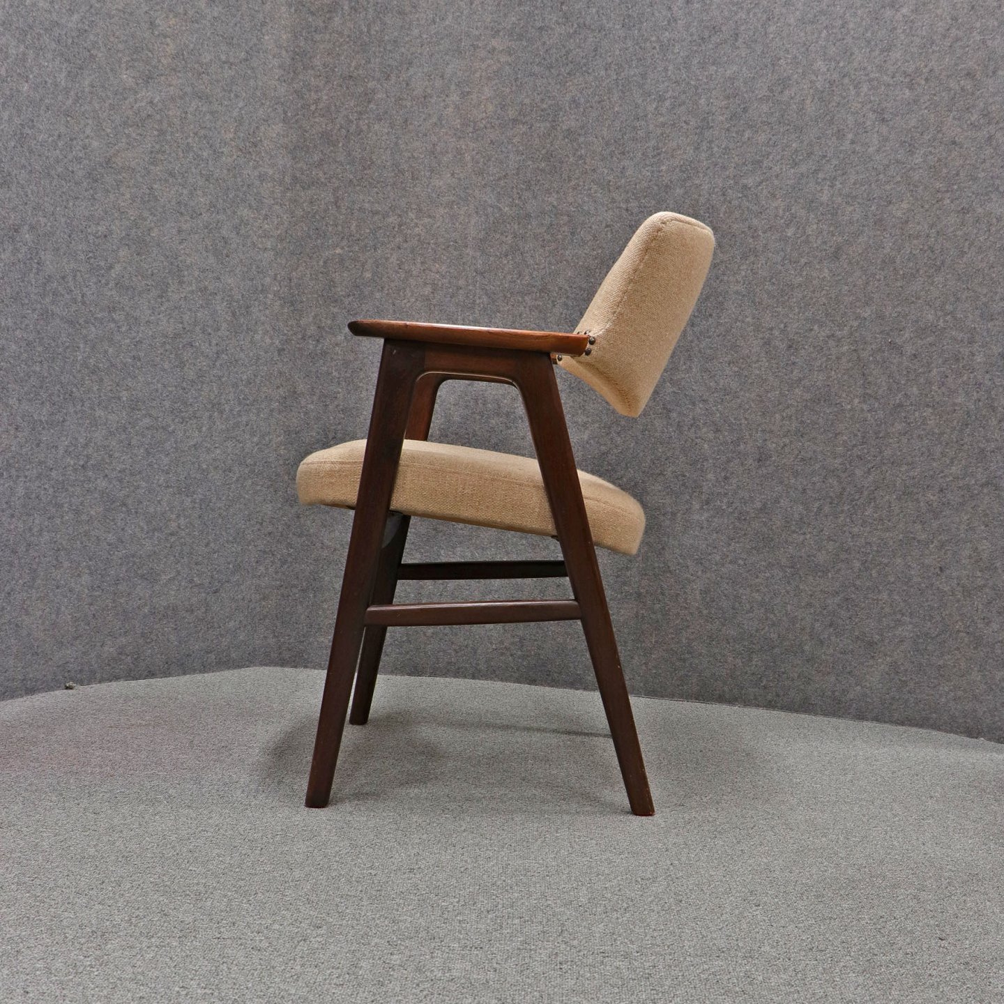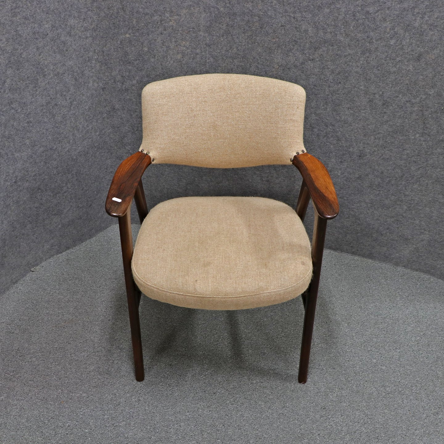 Stol med armlæn i lakeret palisander. Sæde og ryglæn betrukket med beige uldstof.