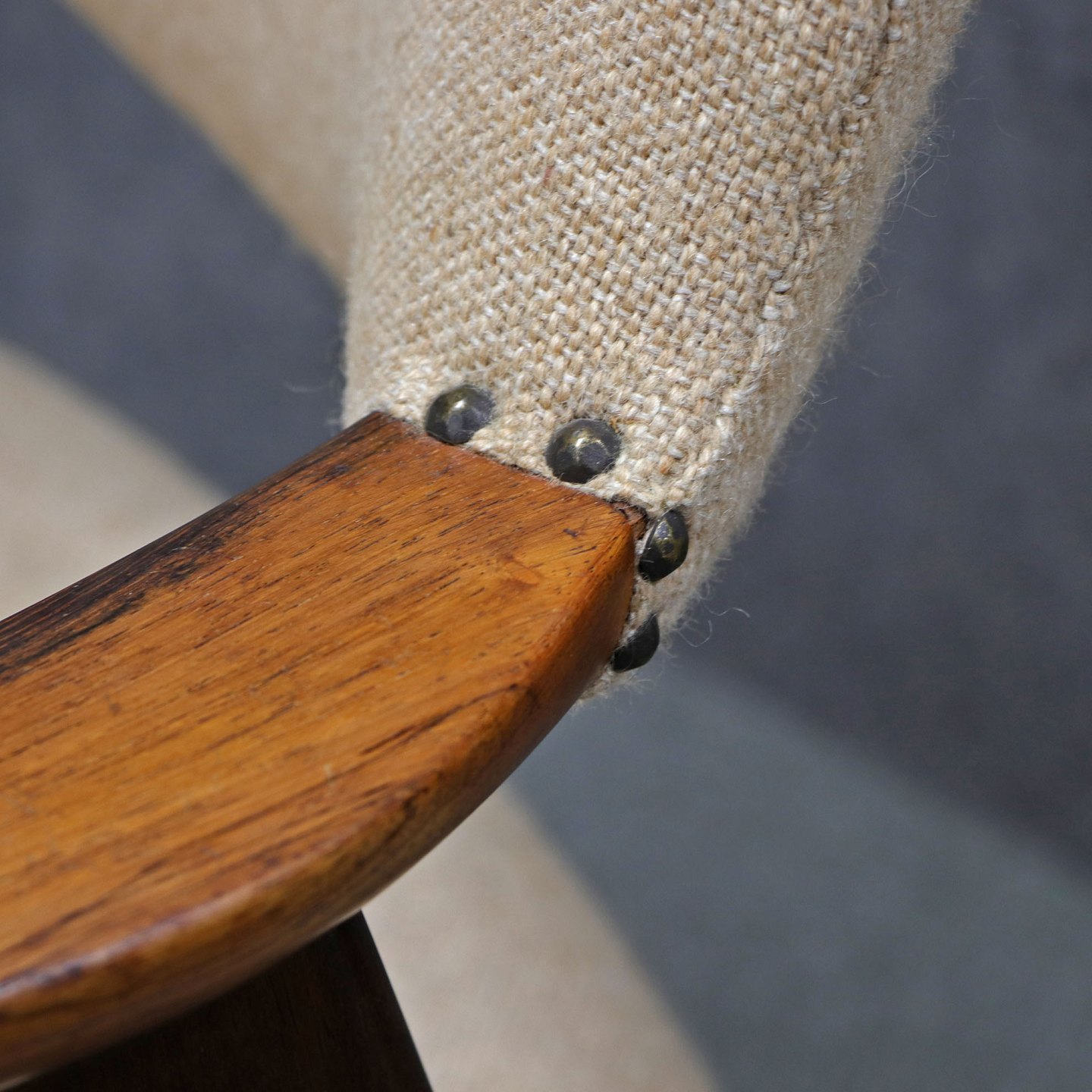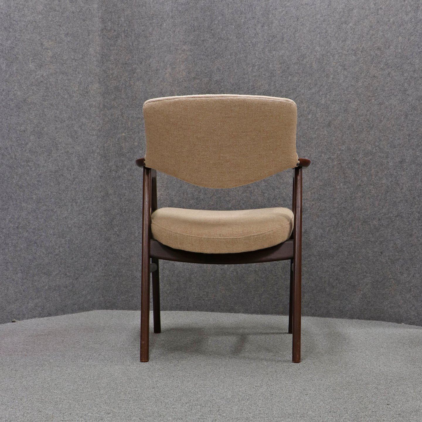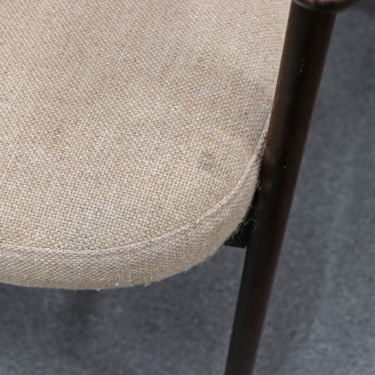 Stol med armlæn i lakeret palisander. Sæde og ryglæn betrukket med beige uldstof.