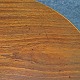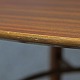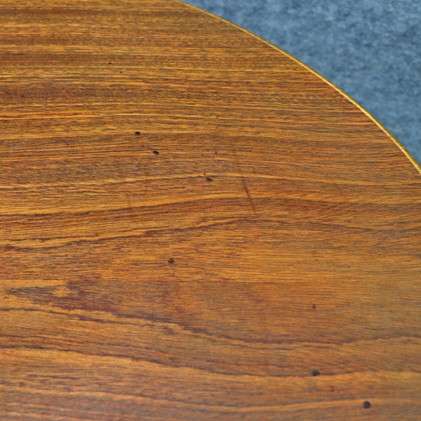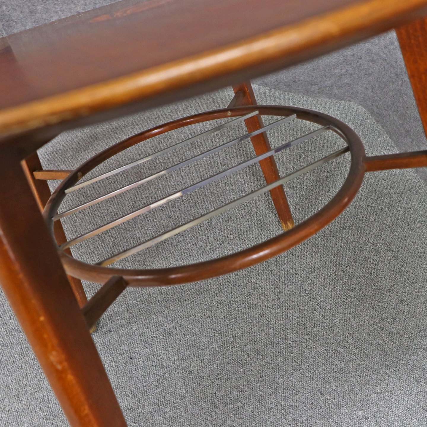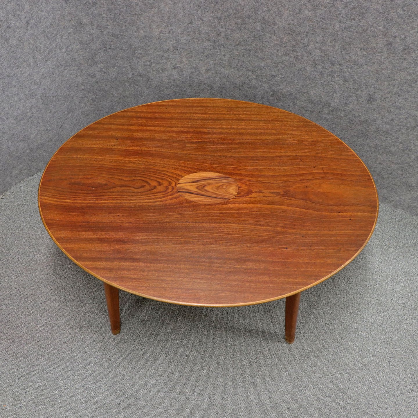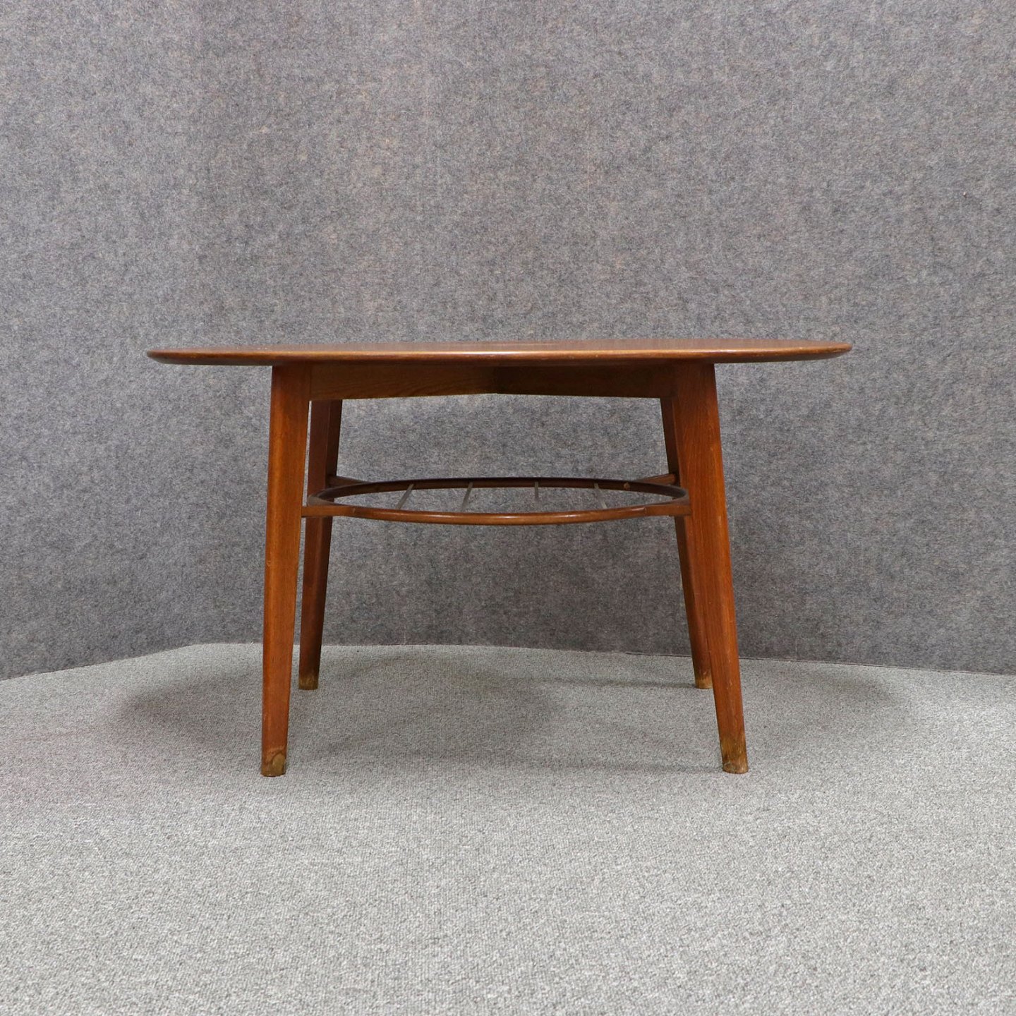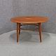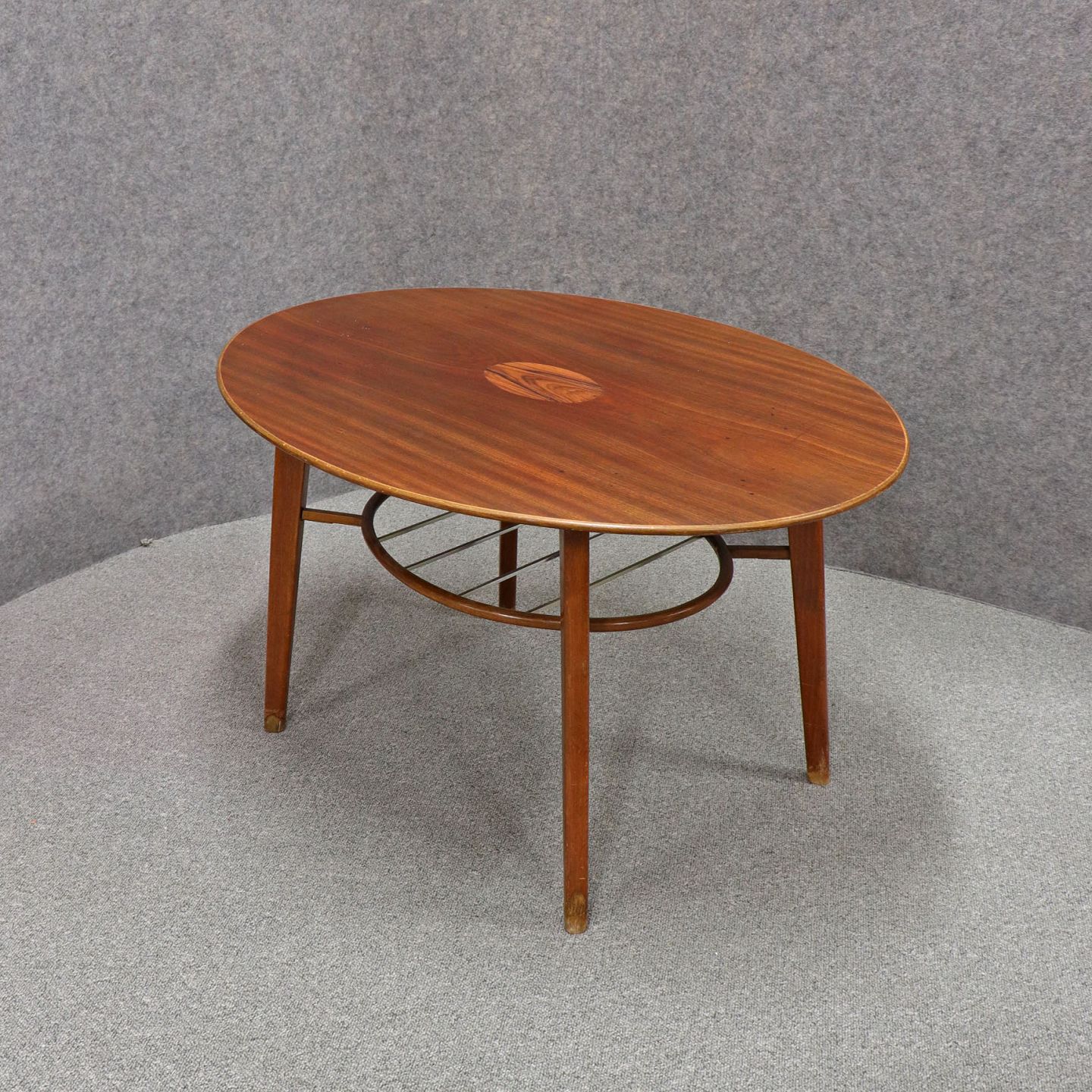 Nyrenoveret ovalt sofabord i mat lakeret teaktræ med hylde af metal lameller.