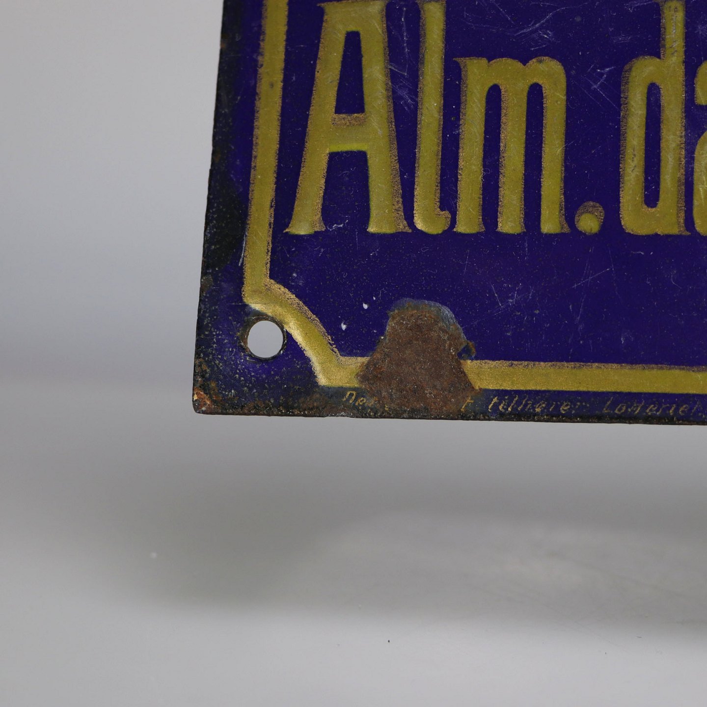 Blåt emalje skilt med teksten Autoriseret Leverandør til Alm. dansk Vare- og Industri- Lotteri