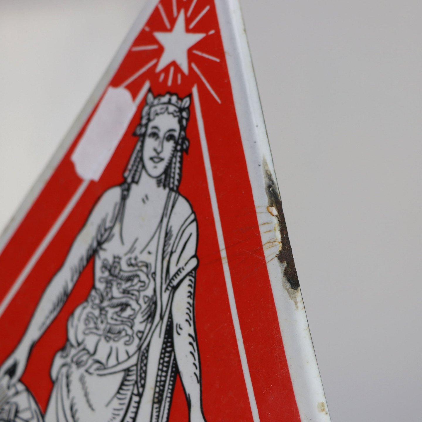 Rødt trekantet emalje skilt med teksten Almindeligt Dansk Vare- og Industrilotteri. Autoriseret Leverandør