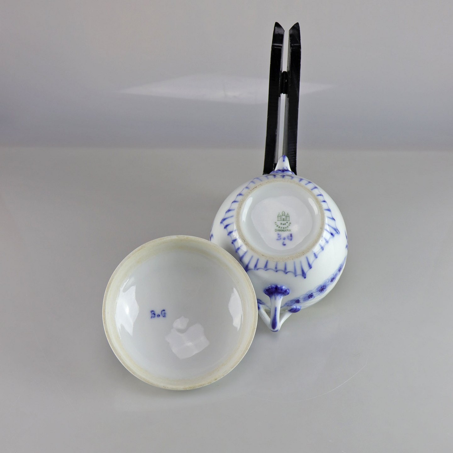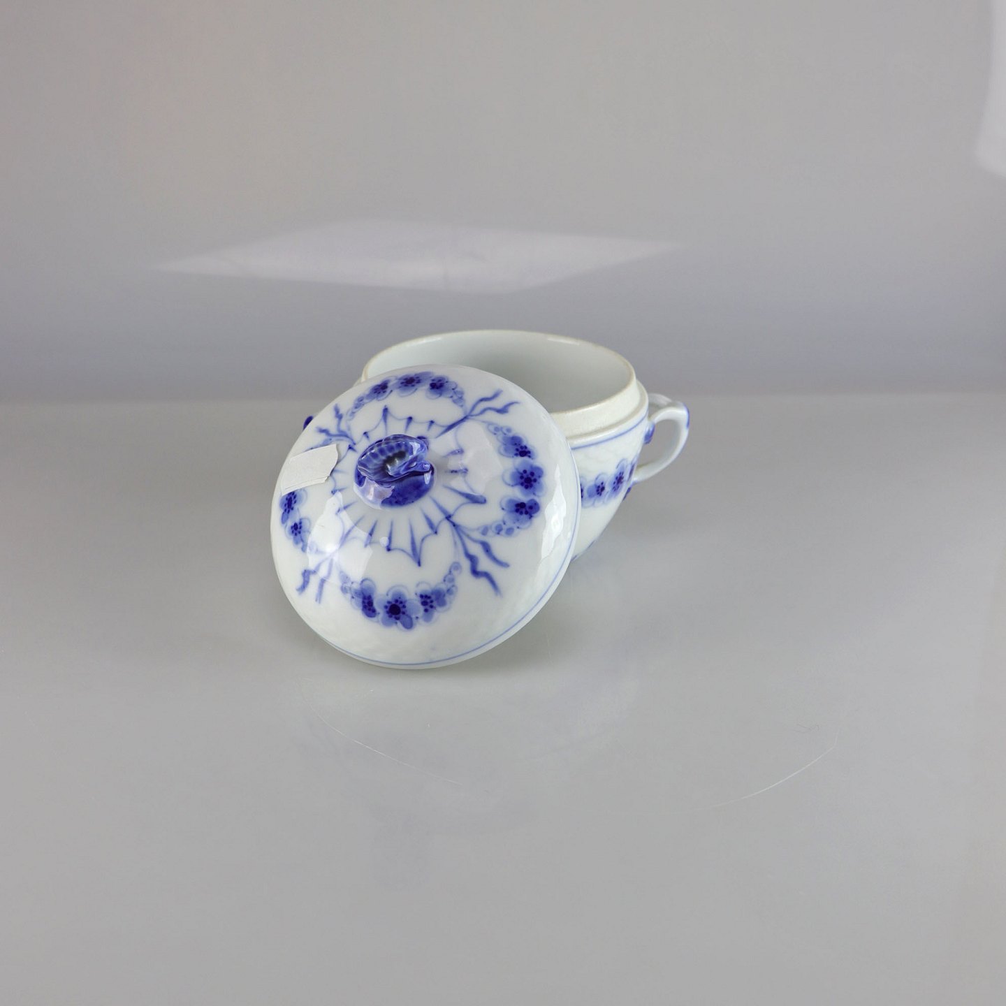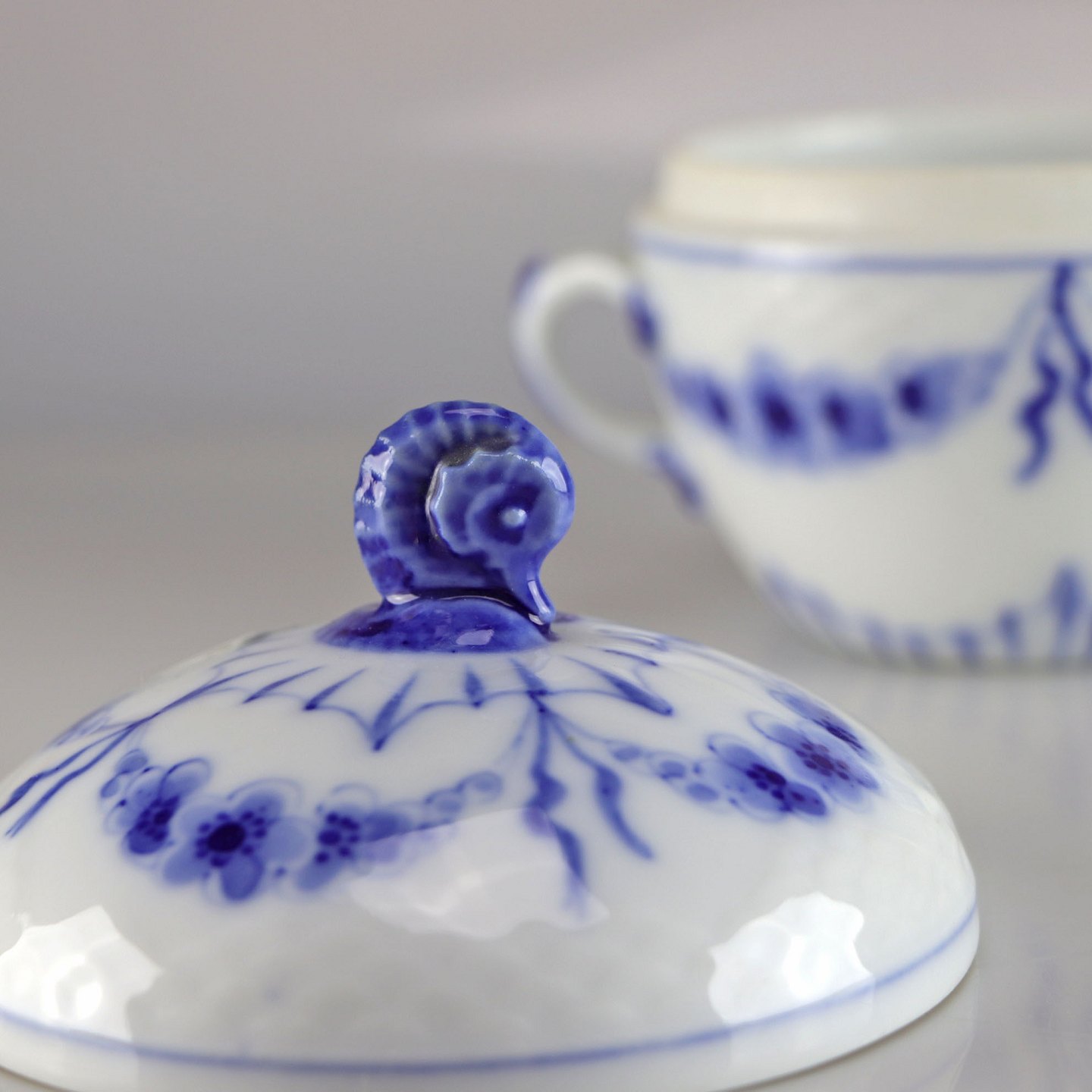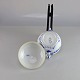 Skål med låg og hanke i hvidt porcelæn med skelform og motiv af guirlander med blå blomster samt blå søhest