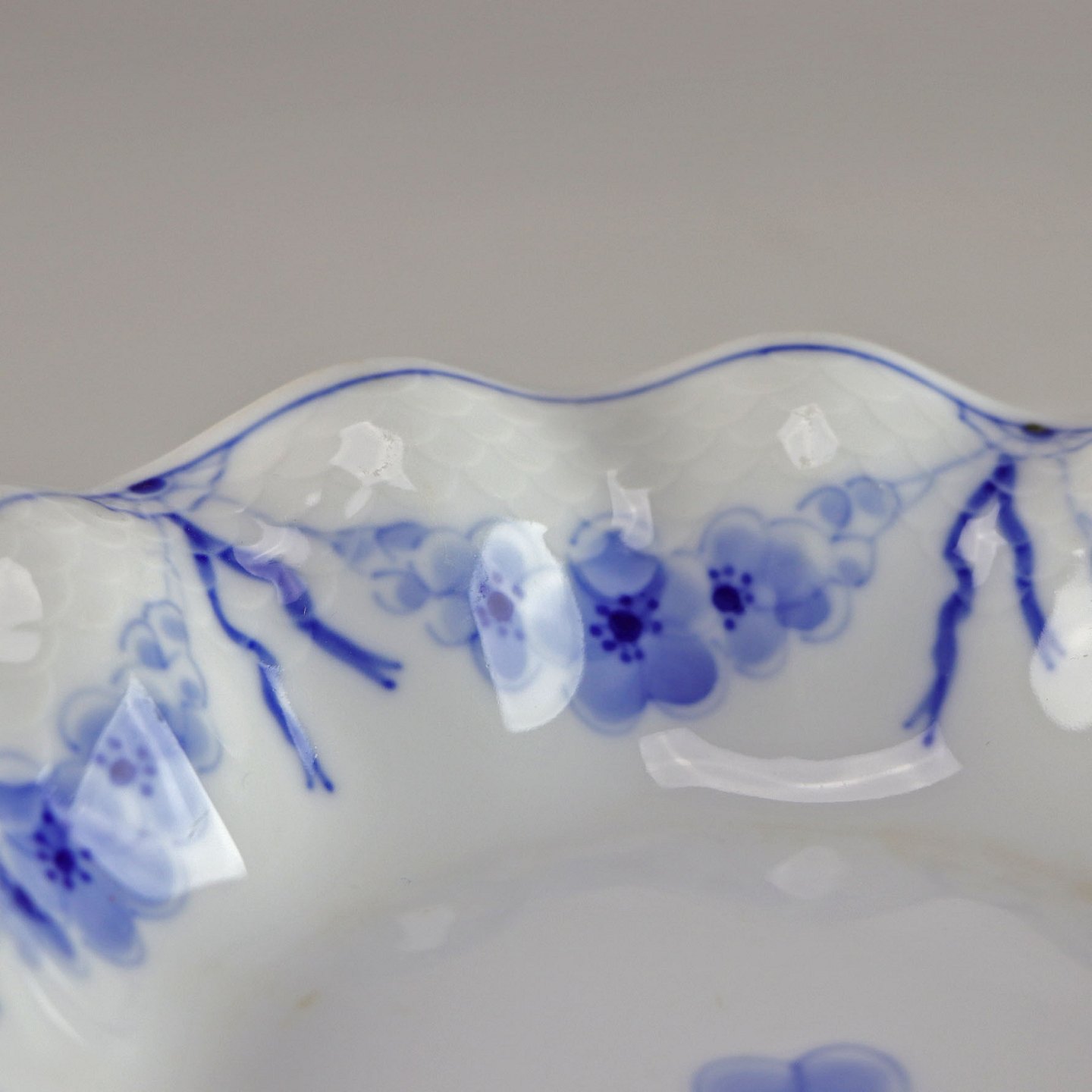 Skål i hvidt porcelæn med skelform og motiv af guirlander med blå blomster