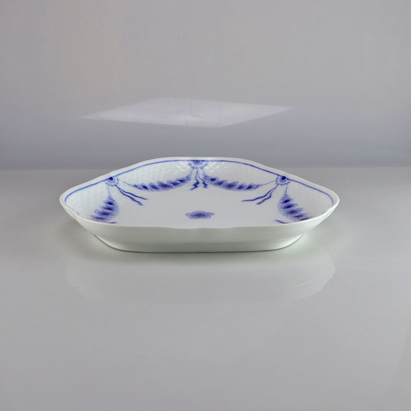 Kagefad i hvidt porcelæn med skelform og motiv af guirlander med blå blomster