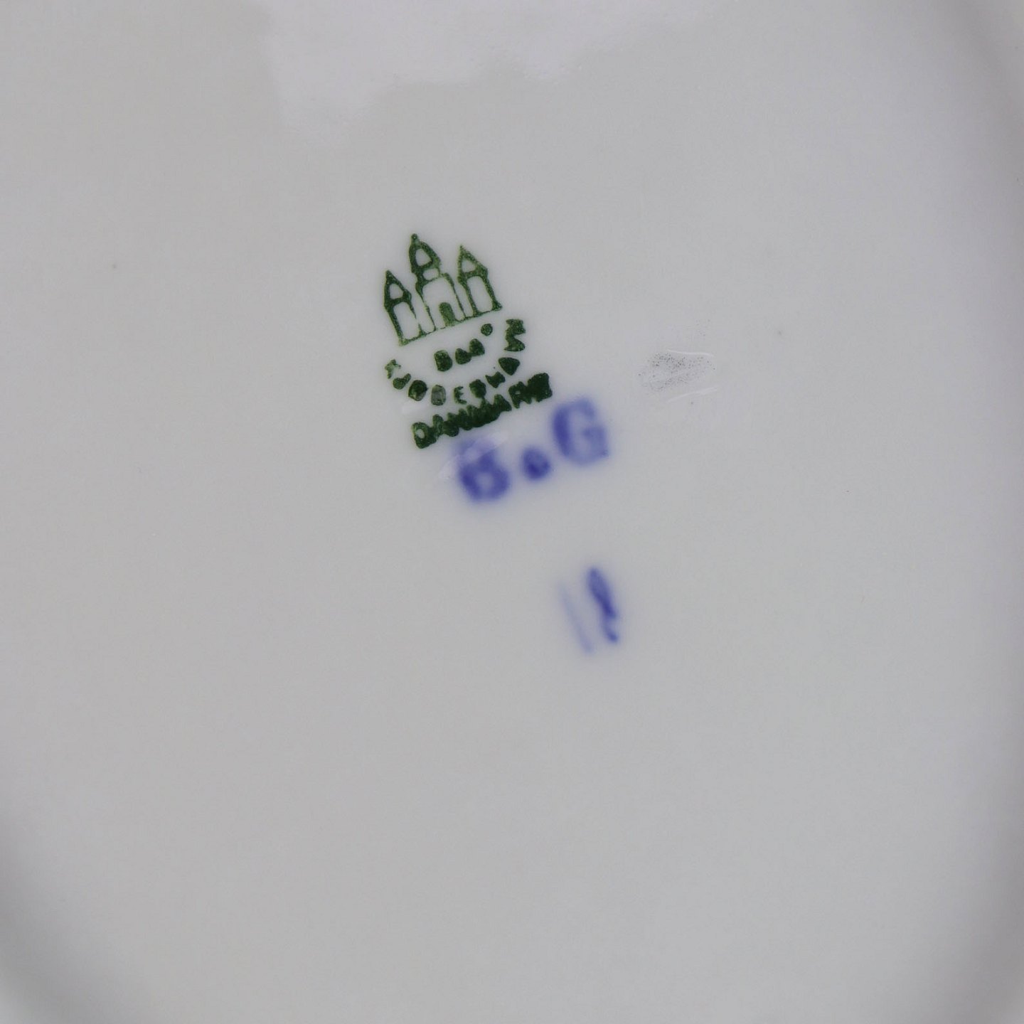 Kagefad i hvidt porcelæn med skelform og motiv af guirlander med blå blomster