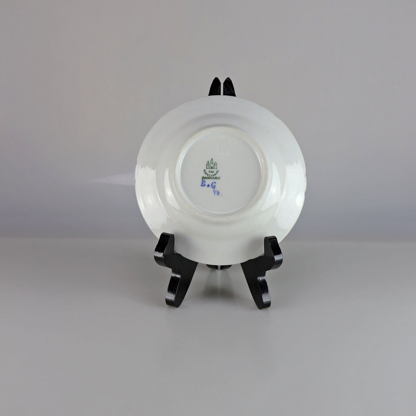 Smørkuvert i hvidt porcelæn med skelform og motiv af guirlander med blå blomster