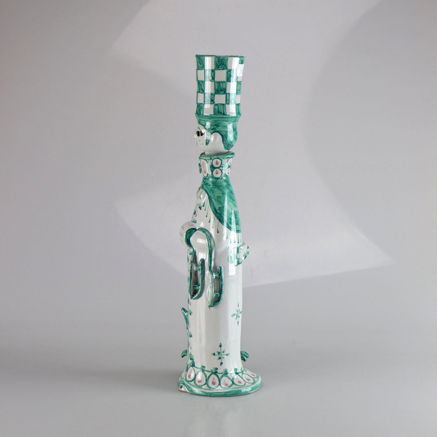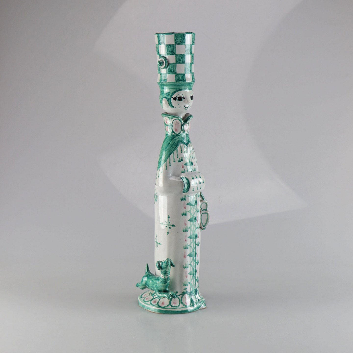 Glaseret keramik med motiv af kvinde med hund og skøjter i grøn dekoration
