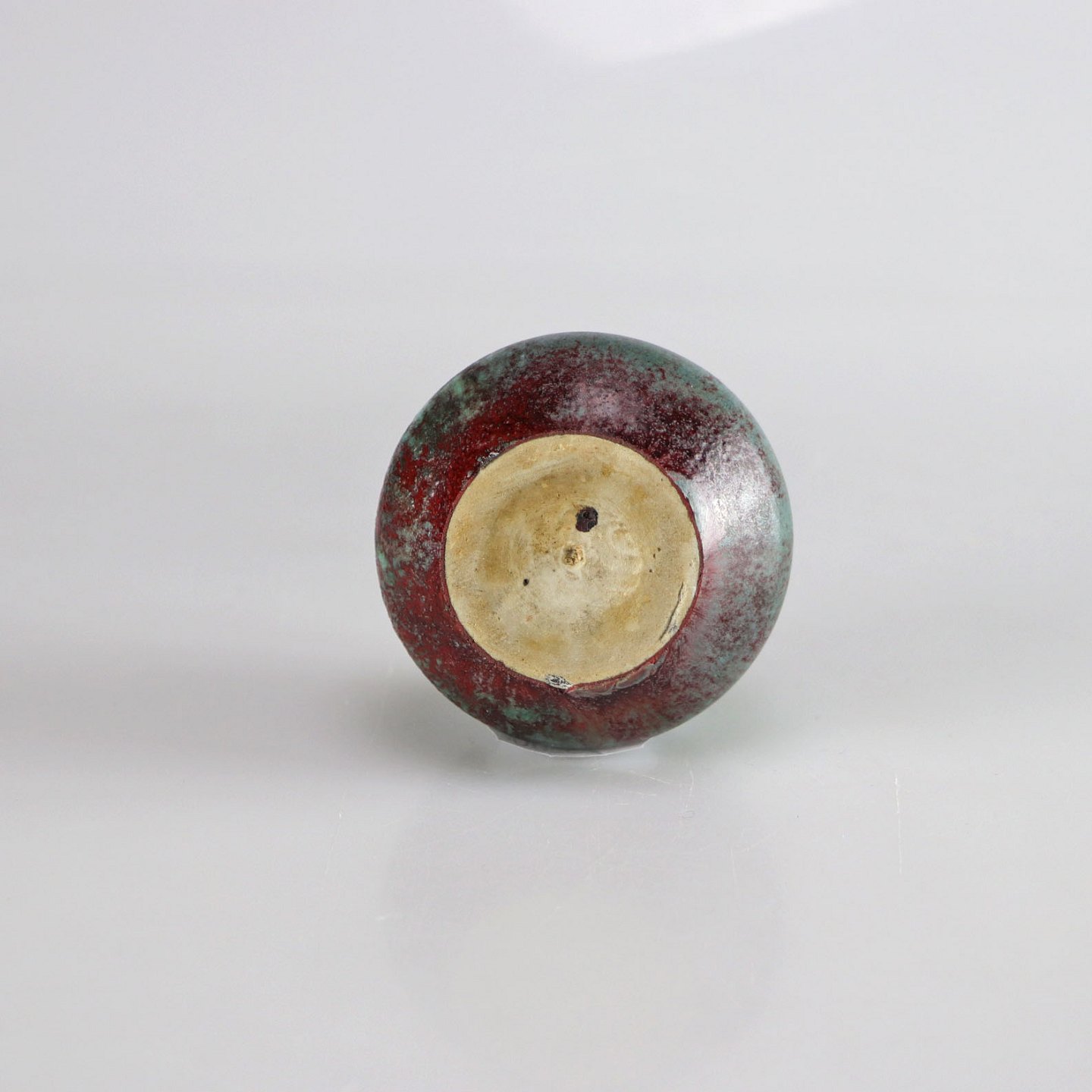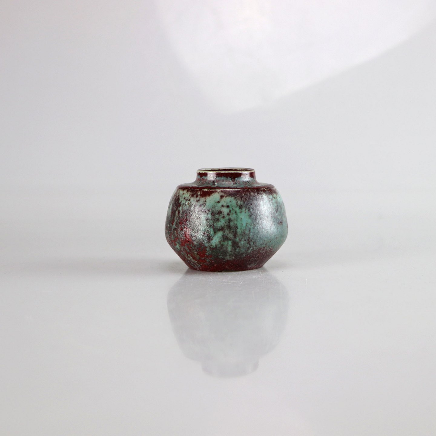 Glaseret rund miniature vase med blå og brunlig glasur