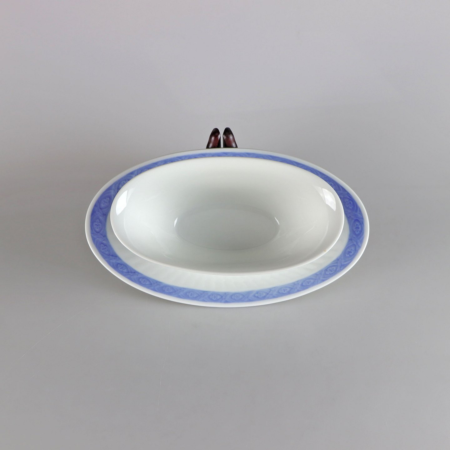 Skål på fod i porcelæn og dekoraktion i to blå nuancer. Stellet er også kendt fra serien Matador.