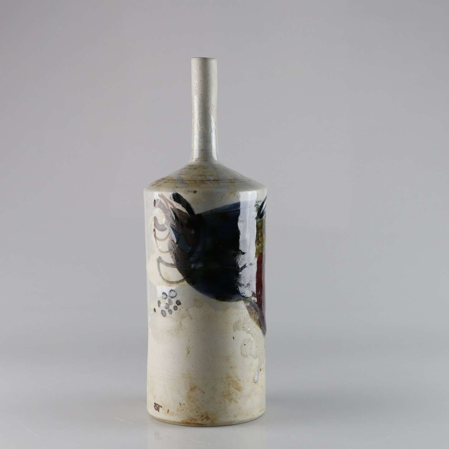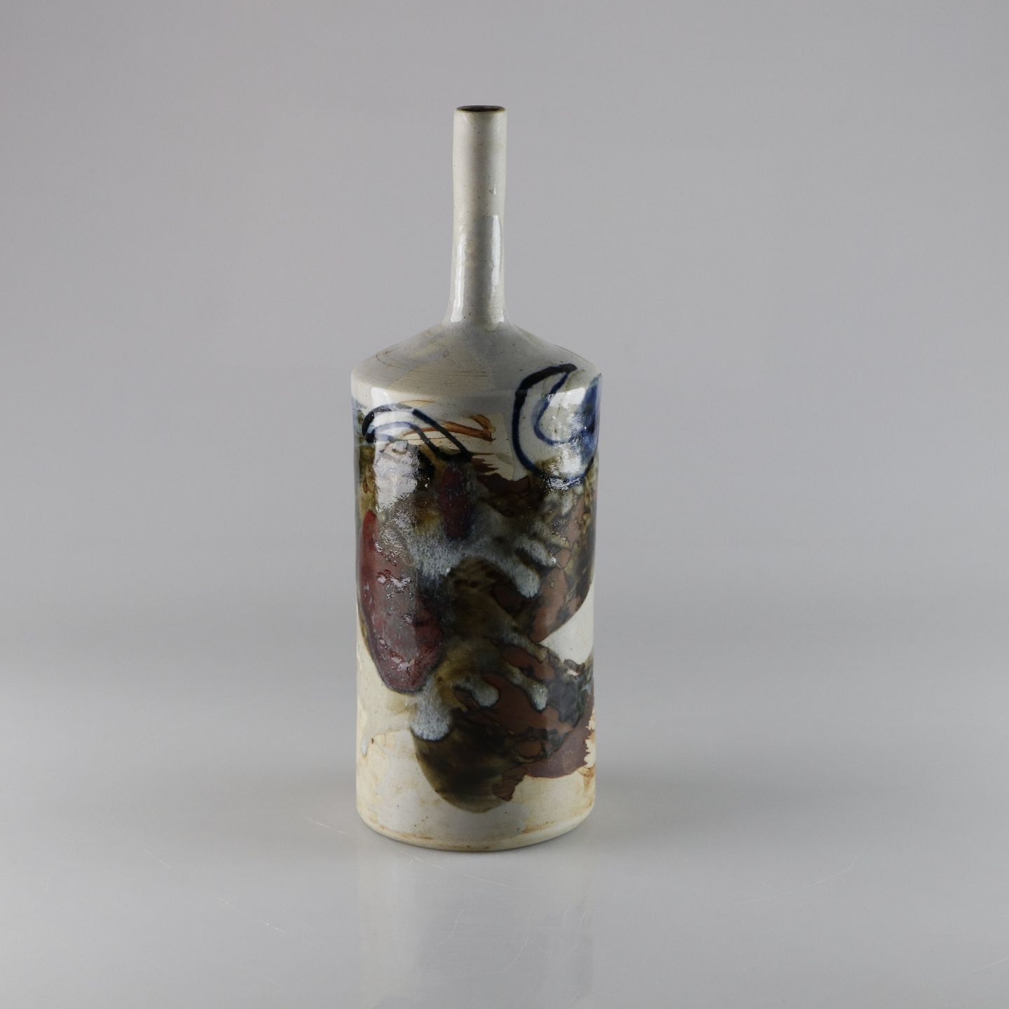 Flaskeformet vase i stentøj med lys glasur med abstrakt blåt og brunt mønster