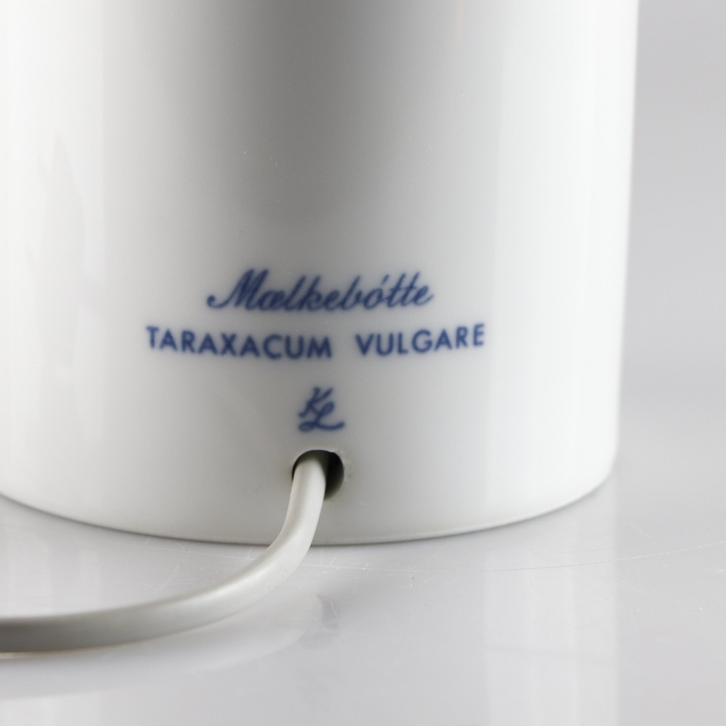 Lampefoden i hvid porcelæn dekoreret med en mælkebøtte i blå farver