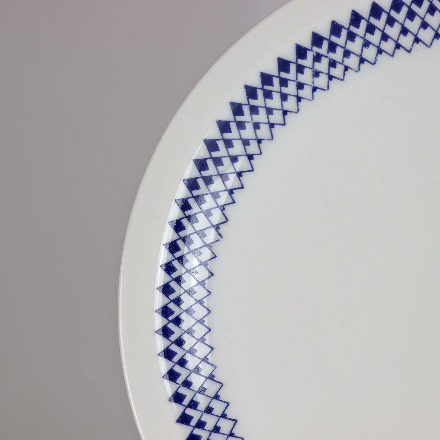 Glat hvidt porcelæn med mørkeblå rombe dekoration