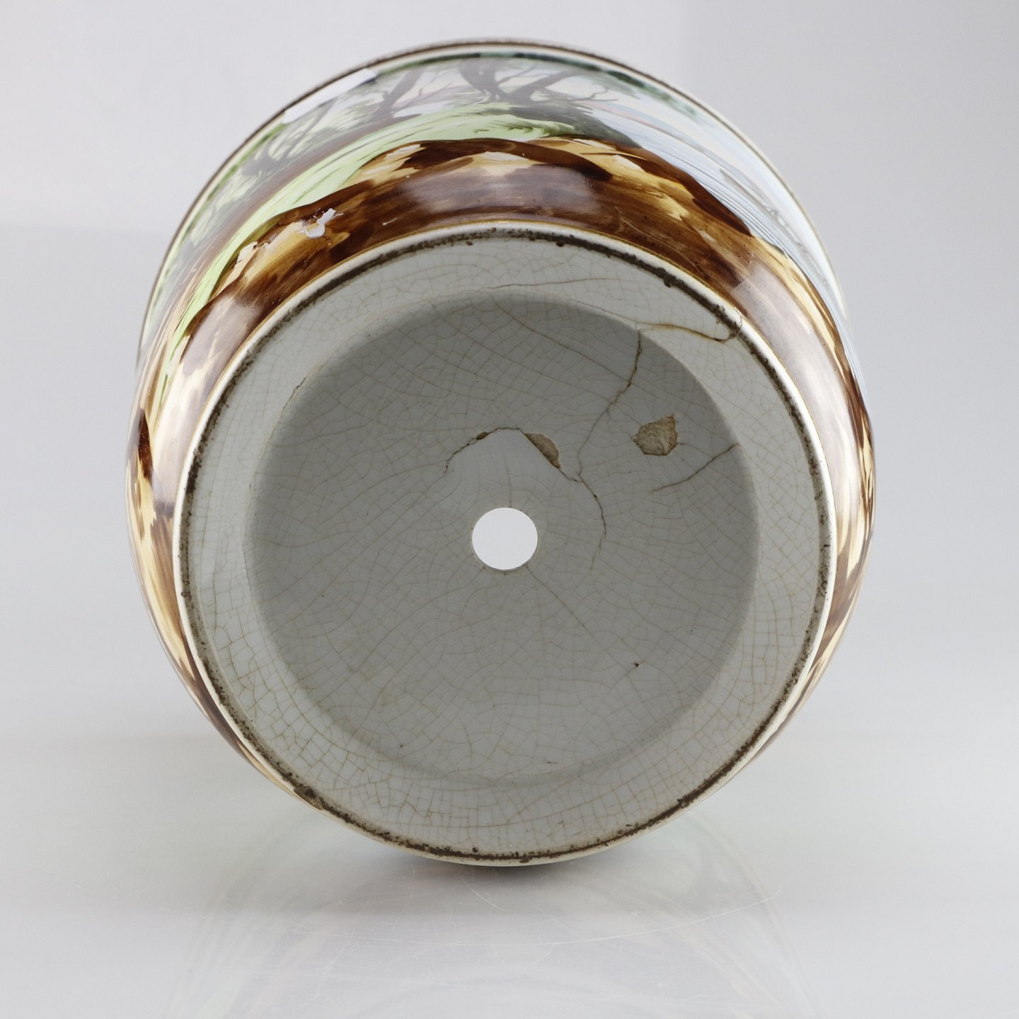 Potteskjuleren er dekoreret med træer ved en sø og i baggrundes ses et hus og bjerge