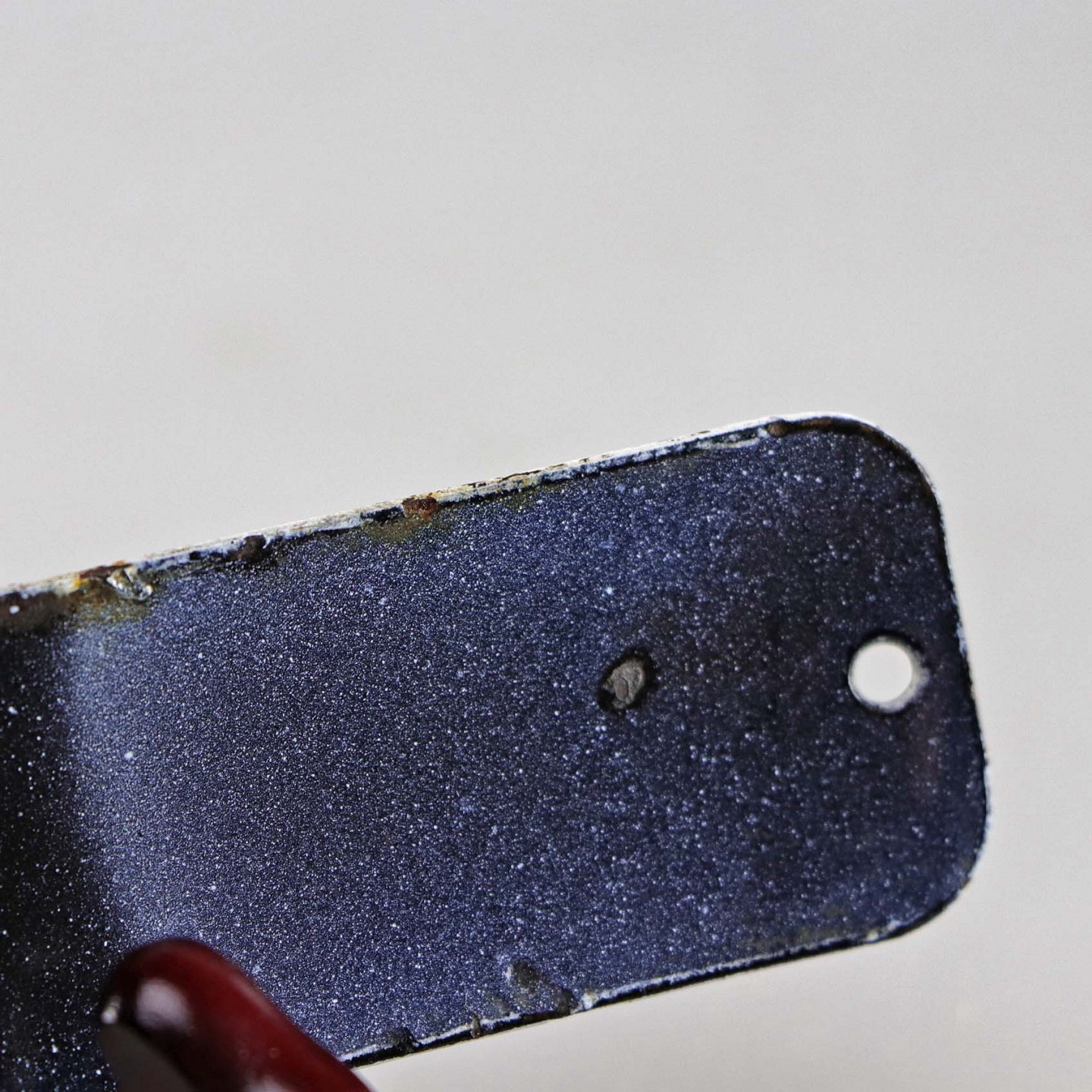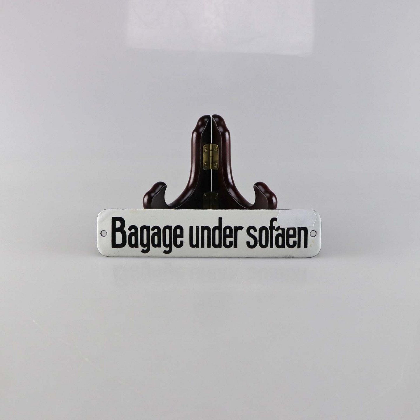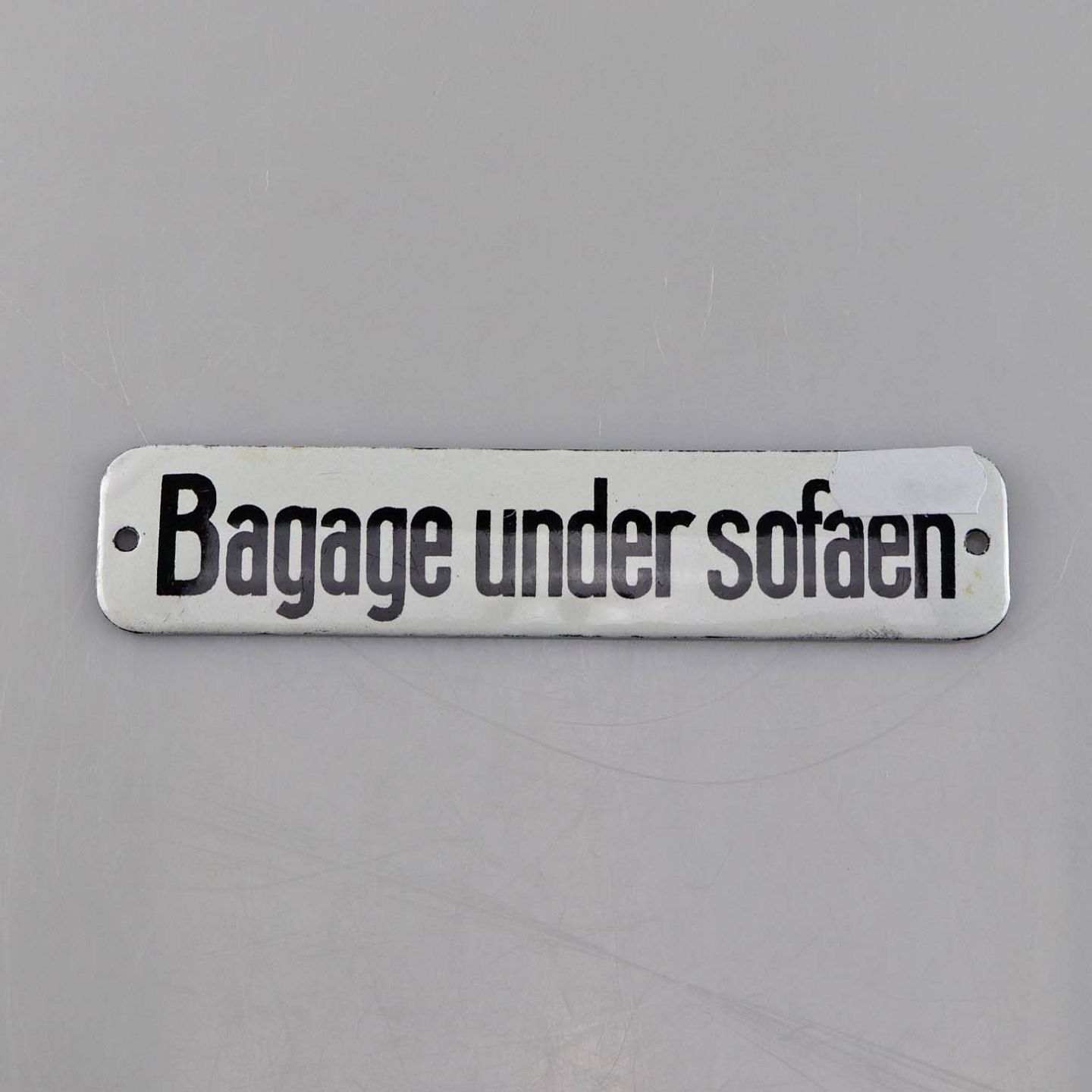 Lille skilt i hvid og sort emalje med teksten Bagage under sofaen
