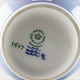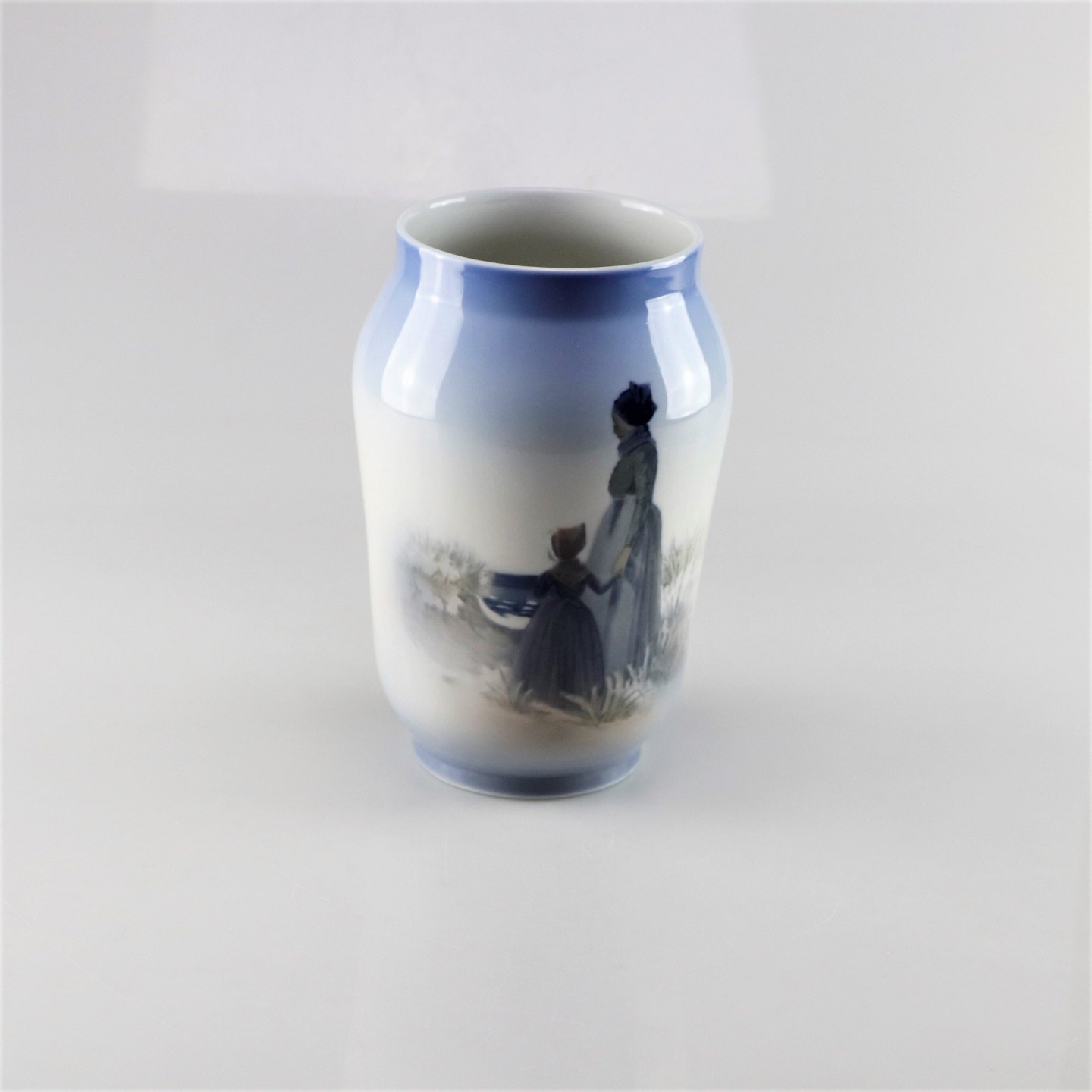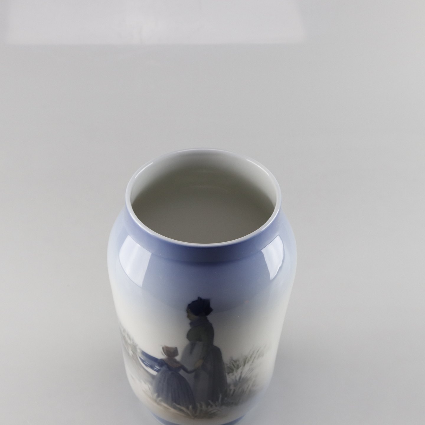 Vase i porcelæn med blå, hvid og grålige farver med motiv af en kvinde og et barn ved en strand