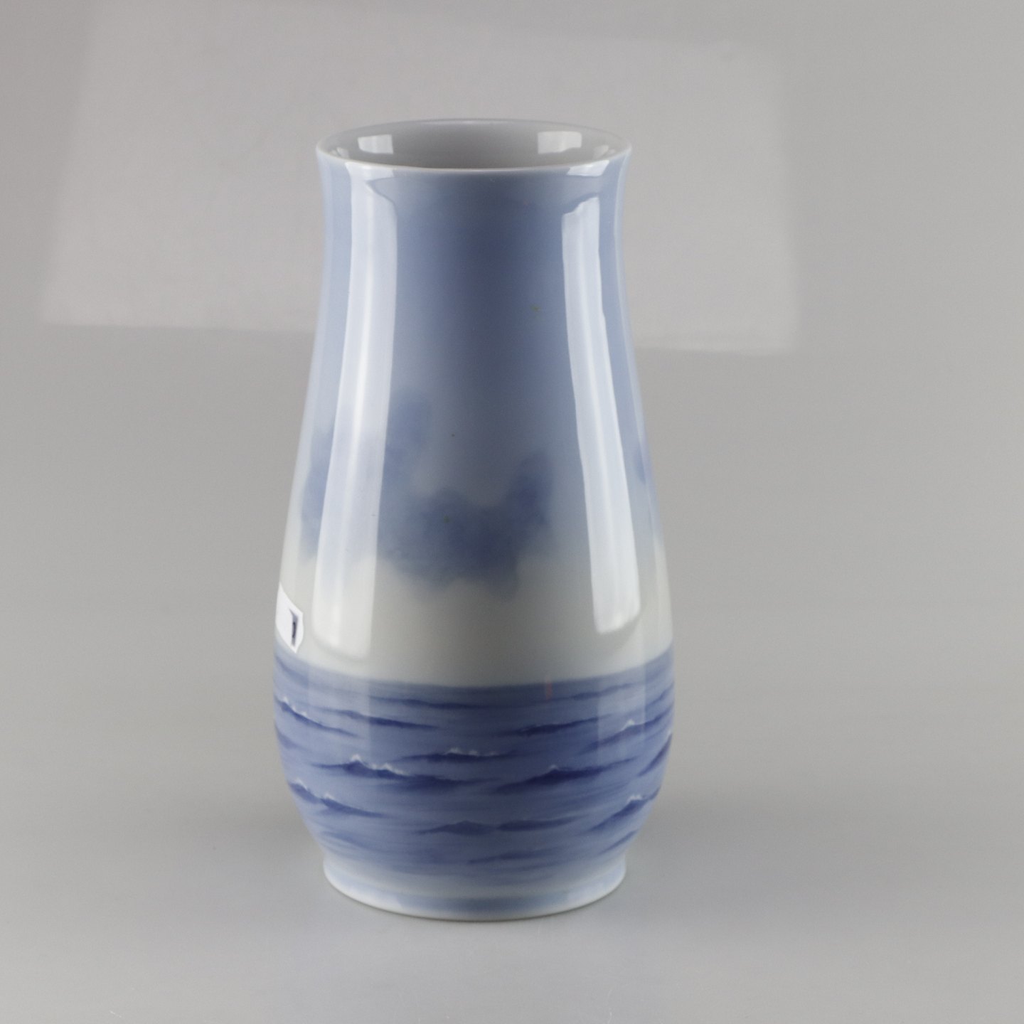 Vase i blå og hvide farver med motiv af sejlbåd på havet