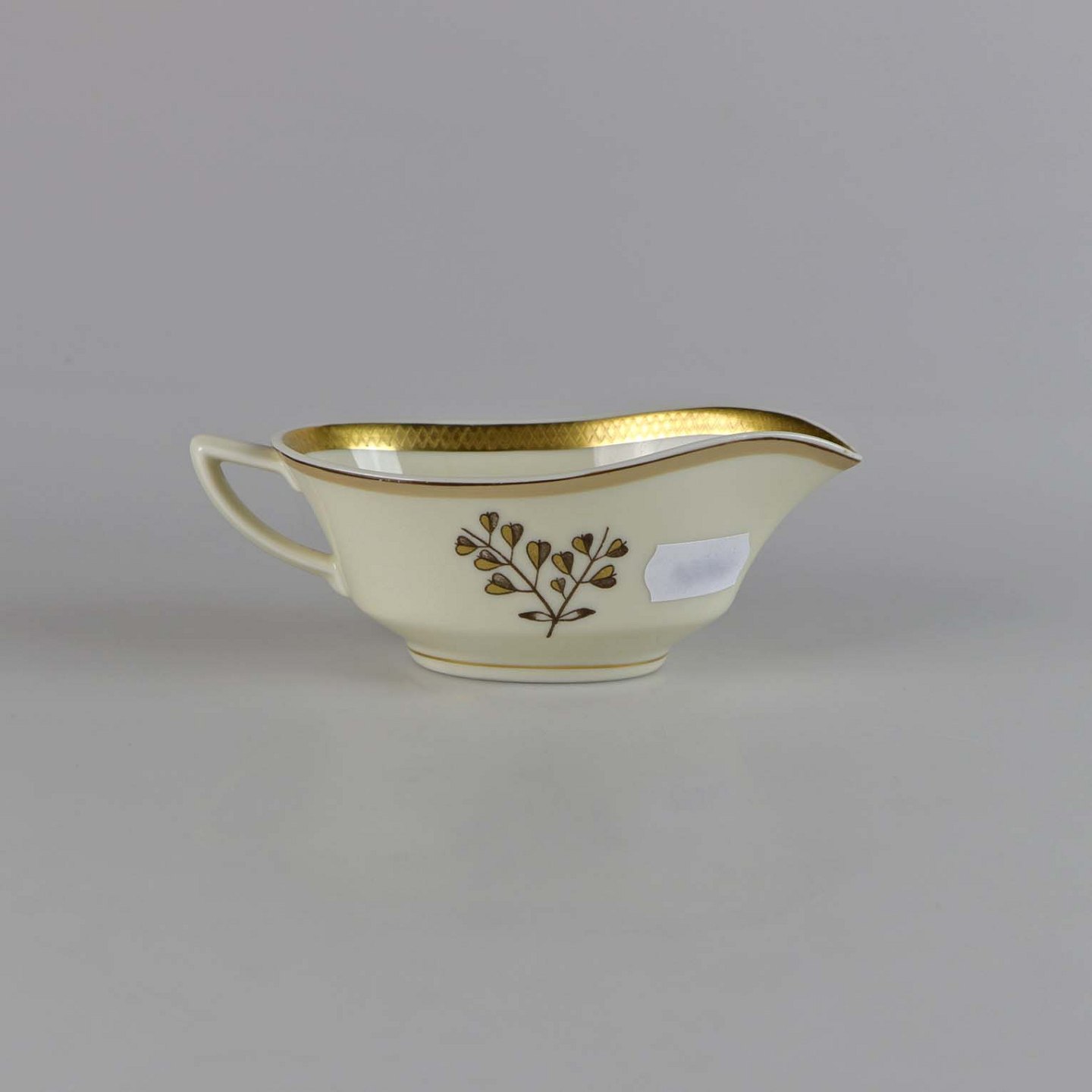 Cremefarvet porcelæn med motiv af gylden kløverblomst og bred graveret guldkantkant.