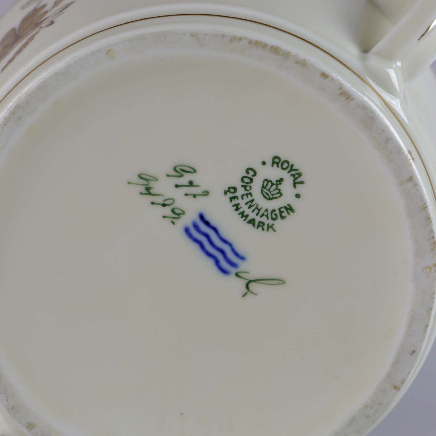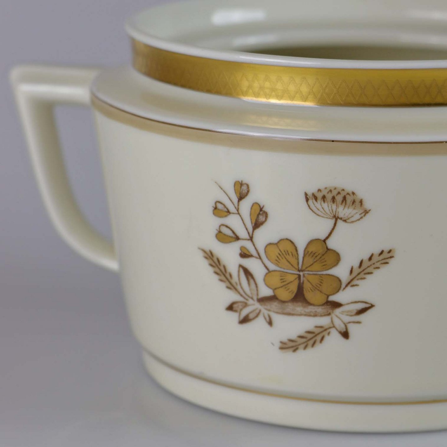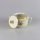 Cremefarvet porcelæn med motiv af gylden kløverblomst og bred graveret guldkantkant.
