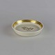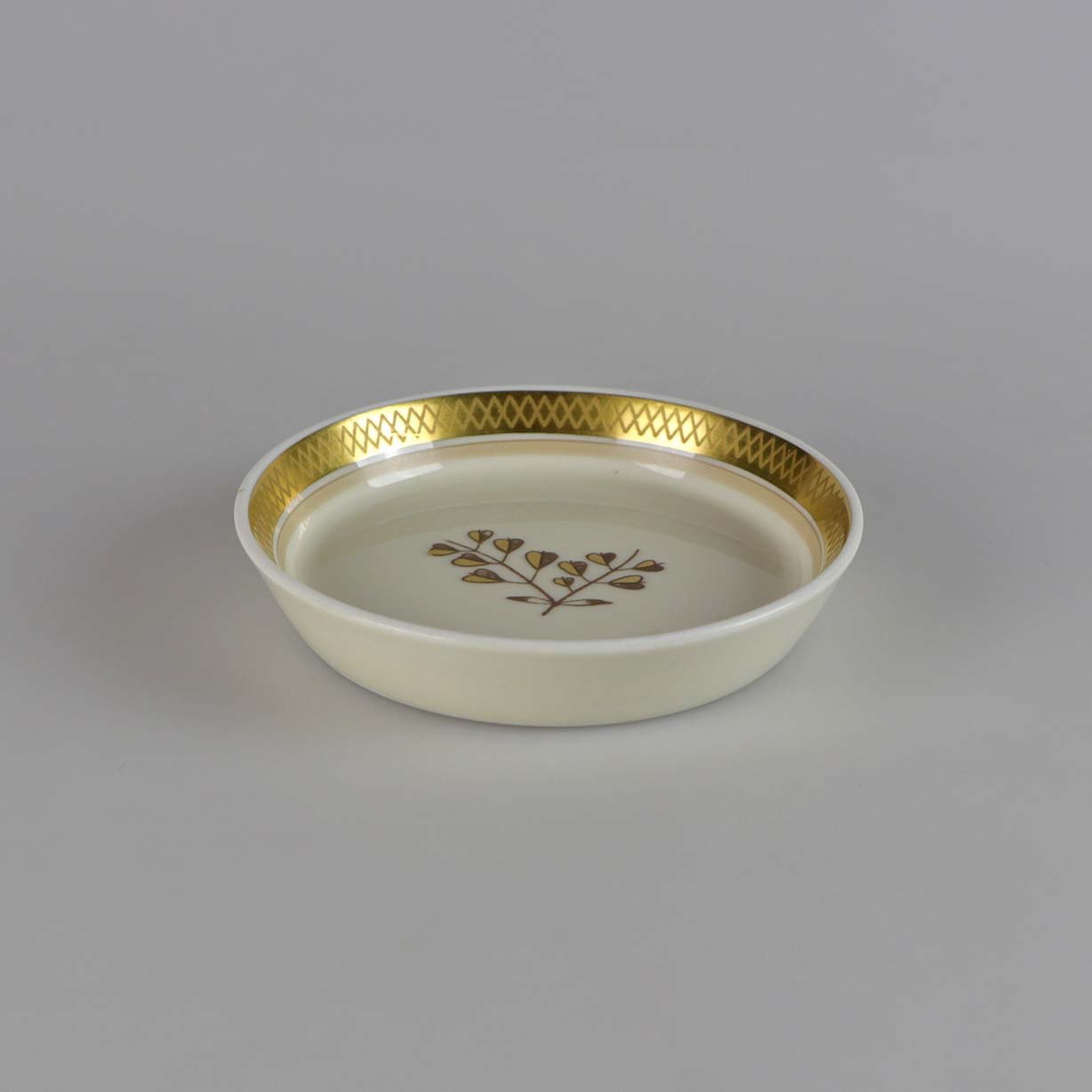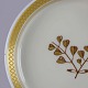 Cremefarvet porcelæn med motiv af gylden kløverblomst og bred graveret guldkantkant.
