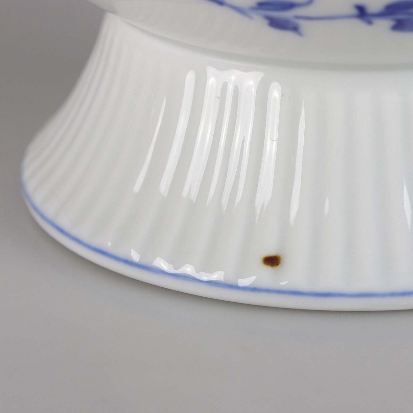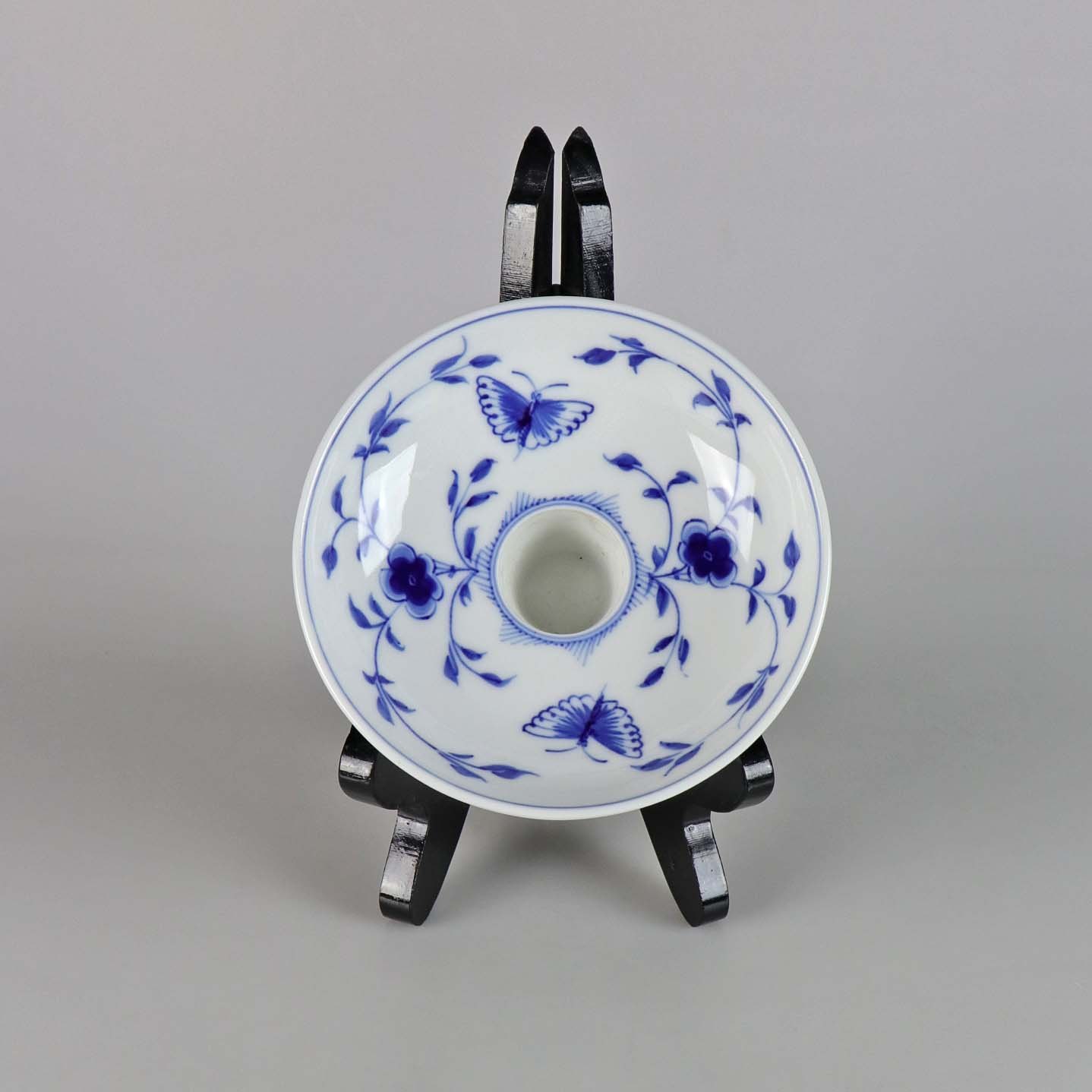 Stage i hvidt porcelæn med blå motiver af blomster og sommerfugle.