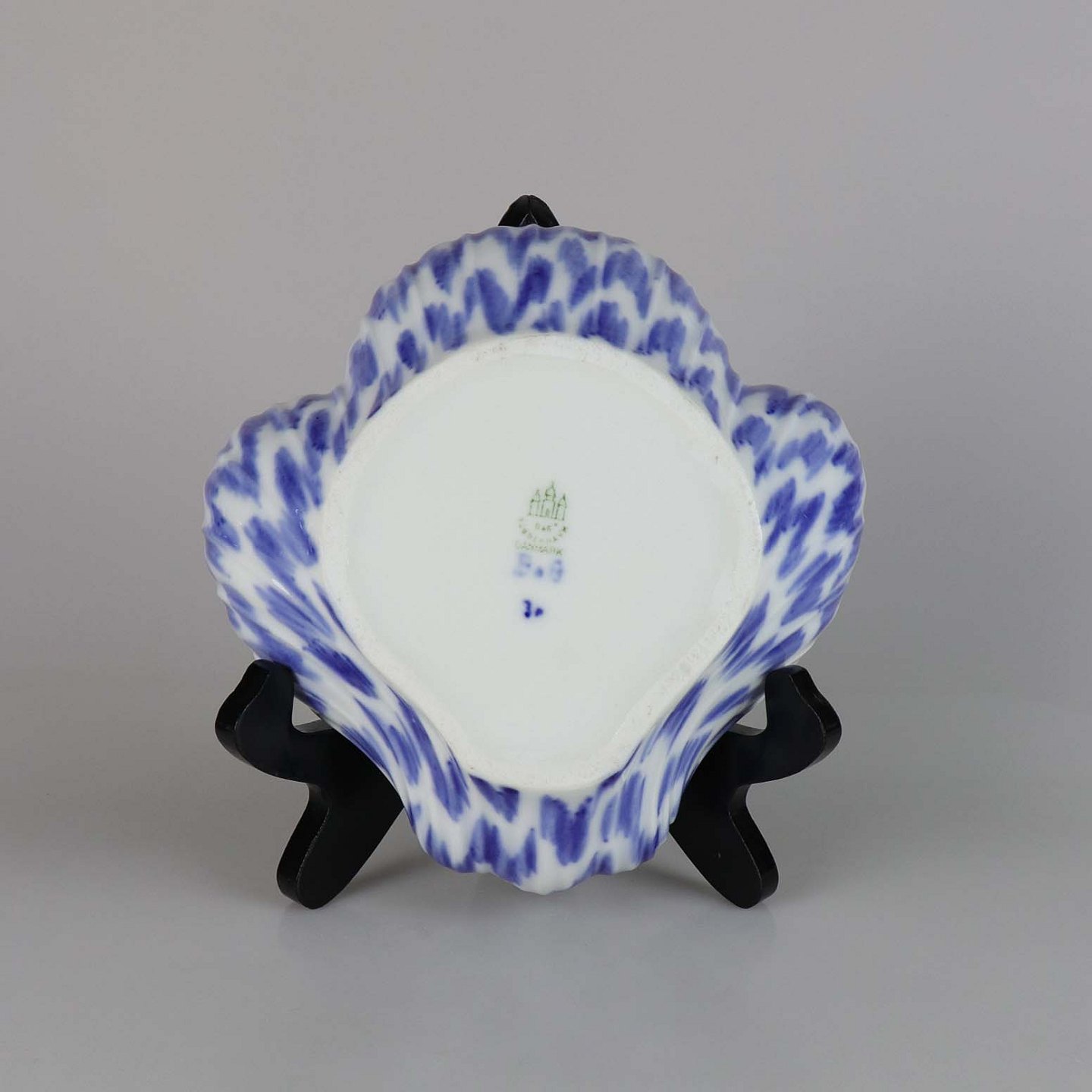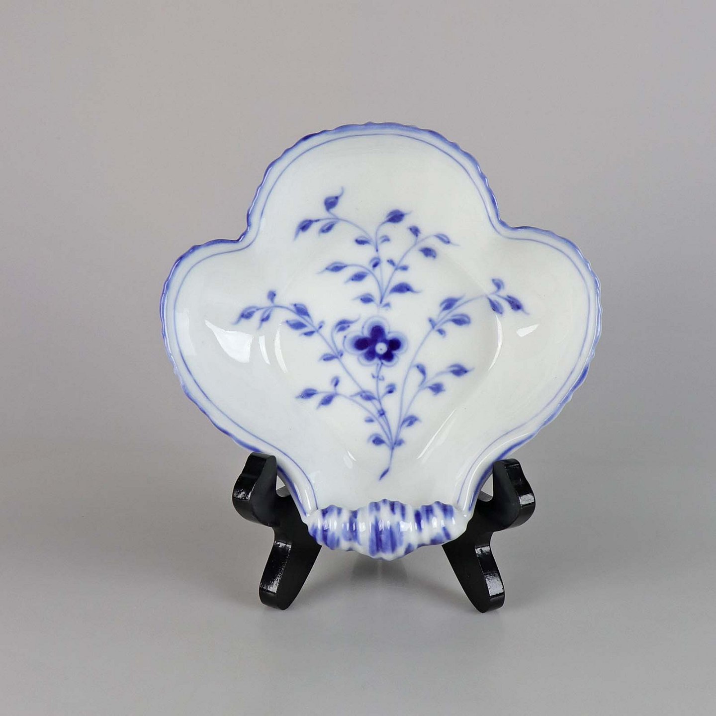 Skål i hvidt skælformet porcelæn med blå motiver af blomster og sommerfugle.