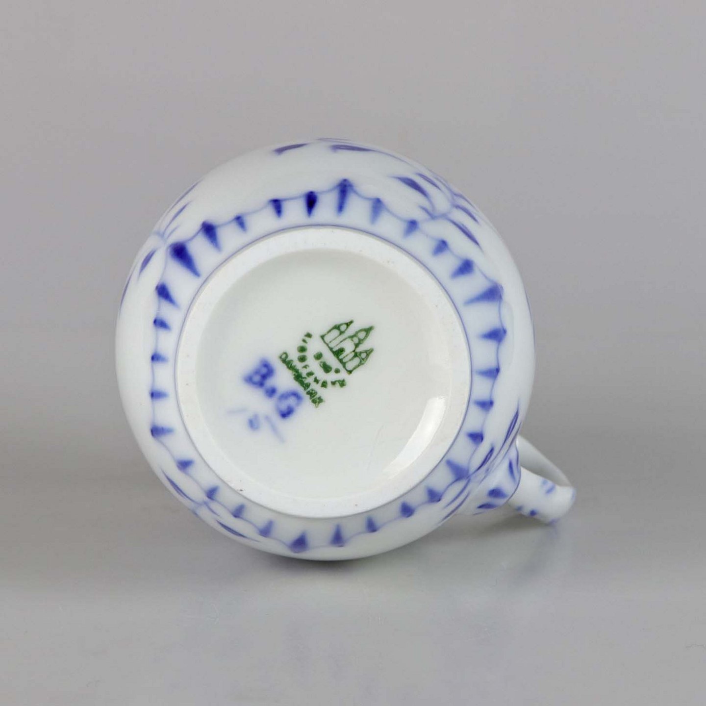 Mælkekande i hvidt skælformet porcelæn med blå motiver af blomster og sommerfugle.