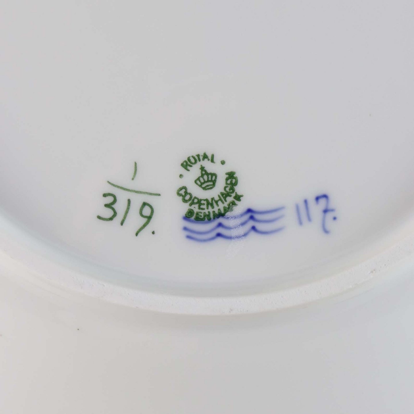 Kongeligt rund fad med hanke fra stellet musselmalet riflet no 1/319