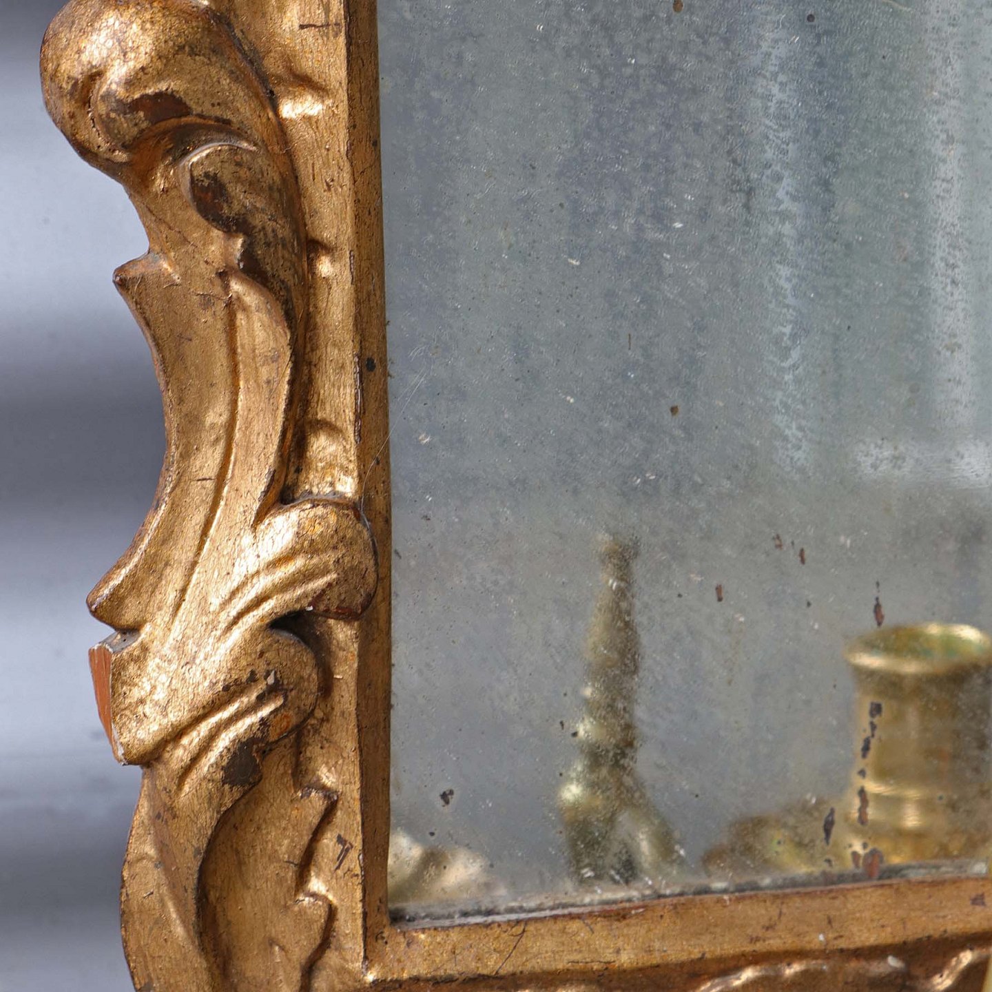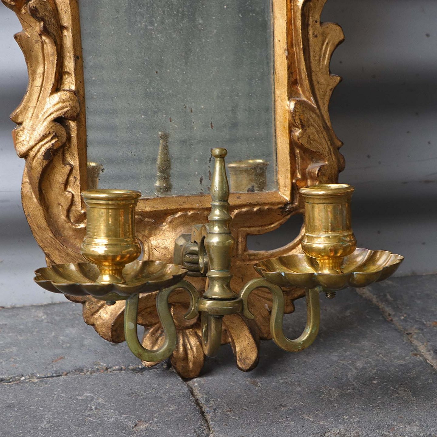 Spejl med guldmalet træramme med en monteret toarmet lysestage i messing.