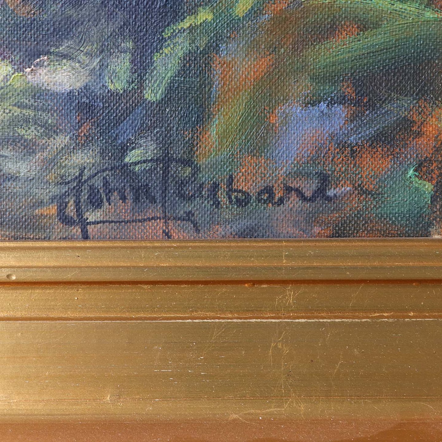 Olie på lærred monteret i forgyldt træramme.