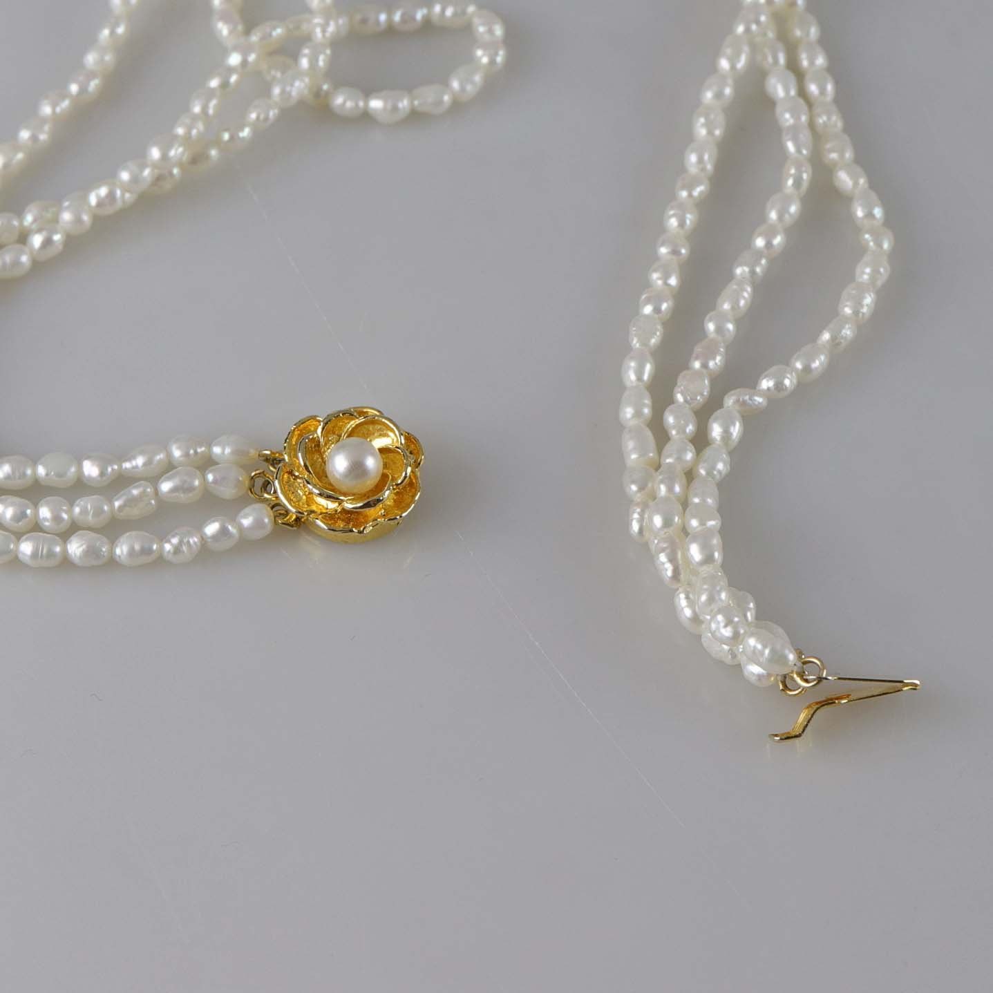 3-radet perlekæde og armbånd med gyldne roser som lås