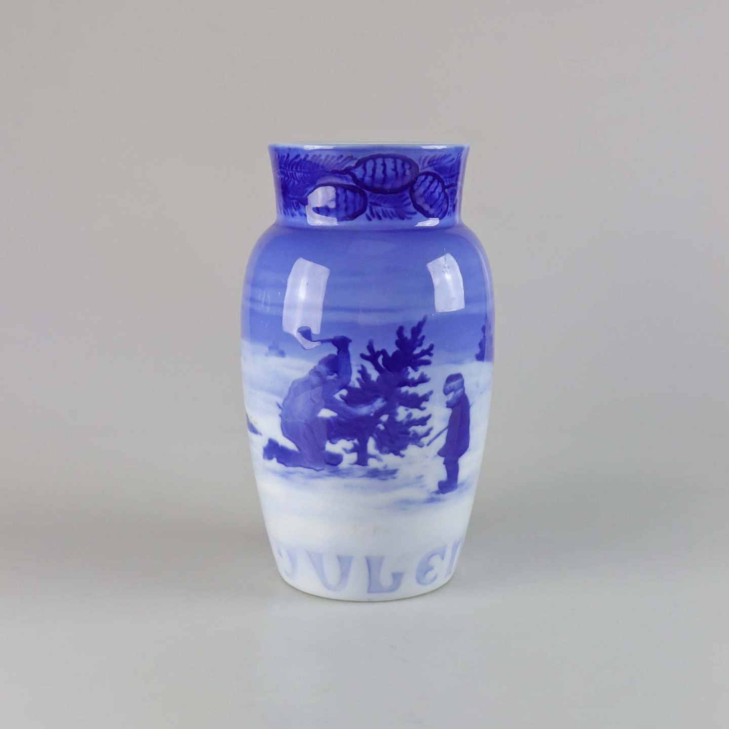 Vase i porcelæn med motiv af to som fælder et grantræ og teksten Julen 1922