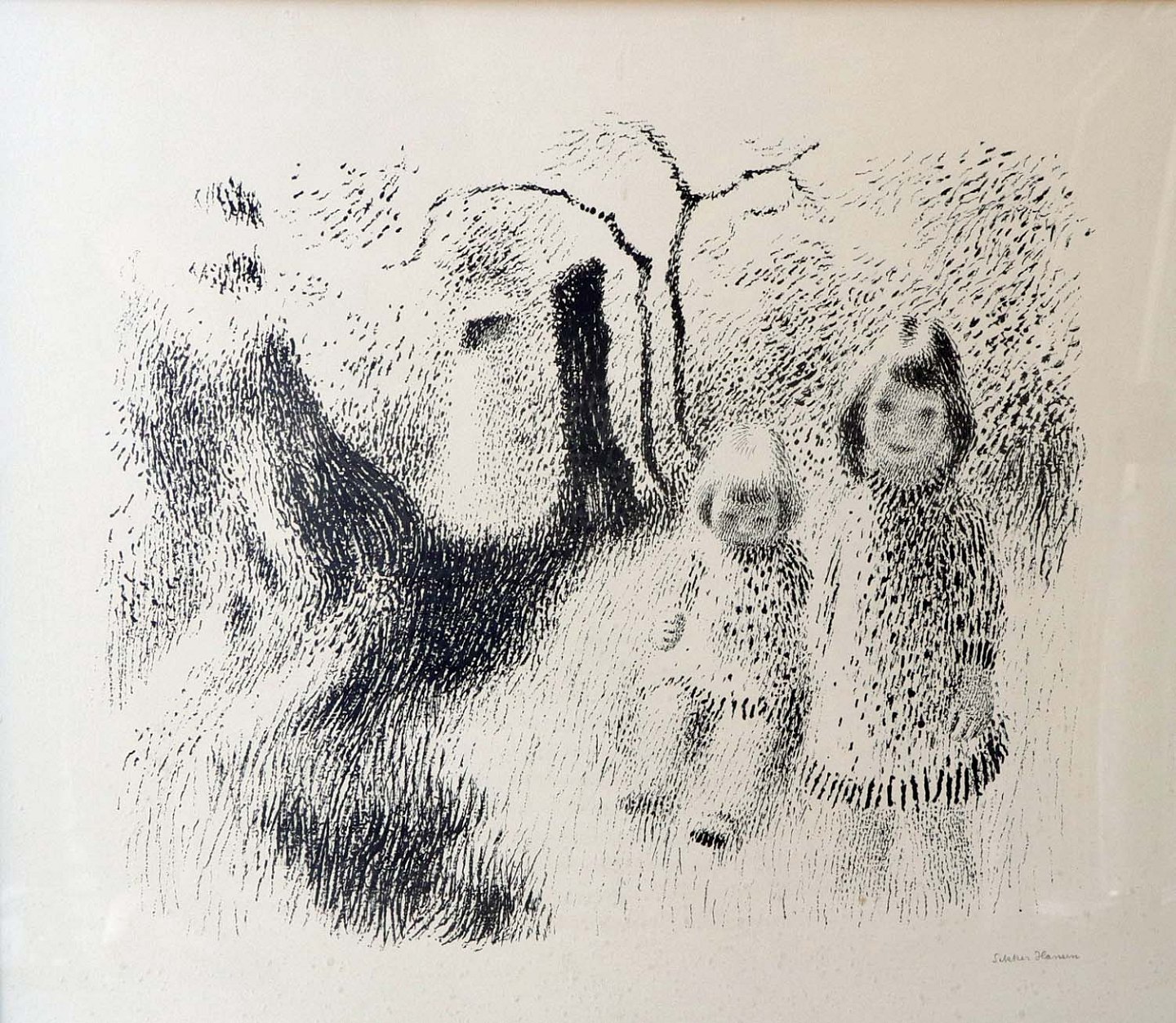 Grafisk tryk med motiv af to børn i skoven.