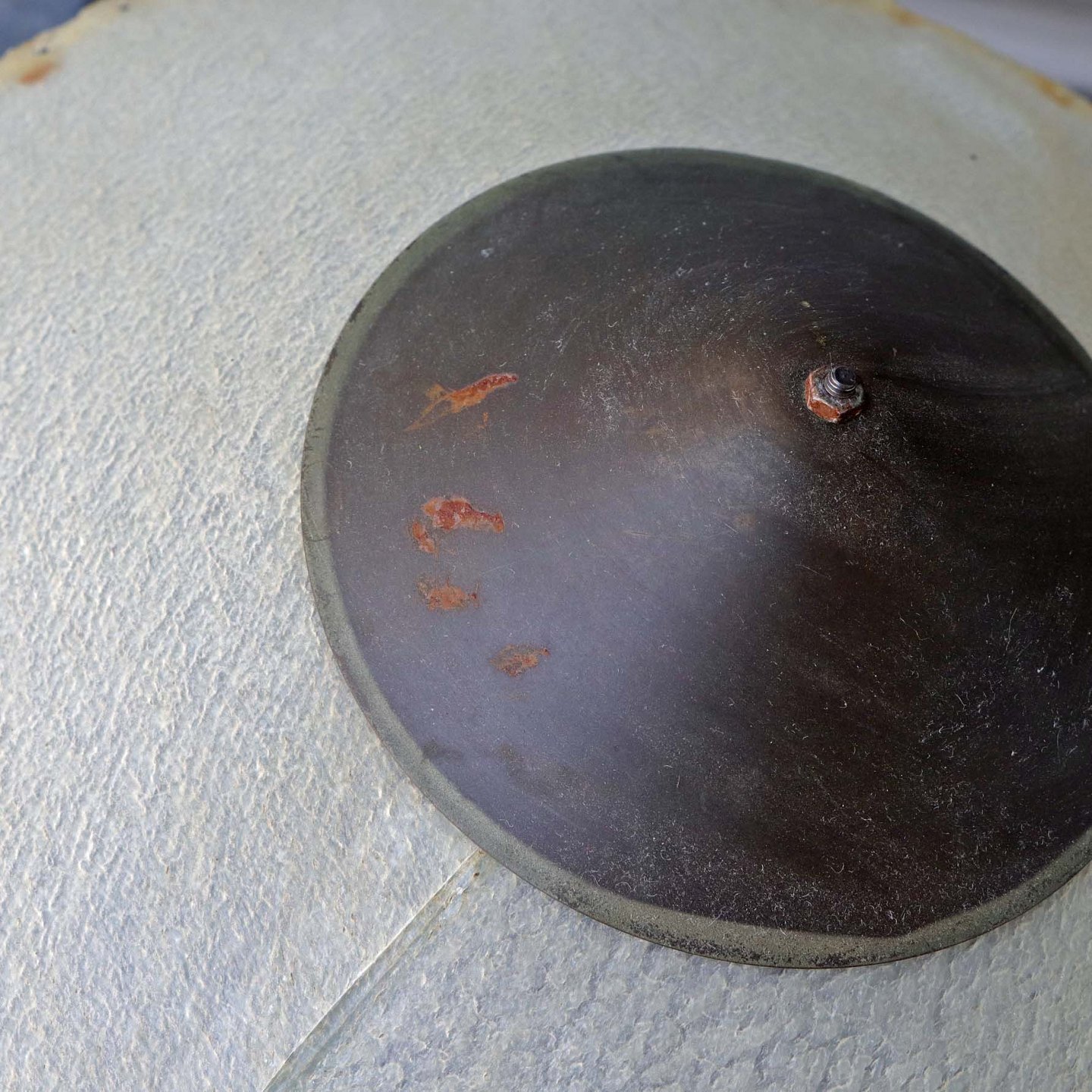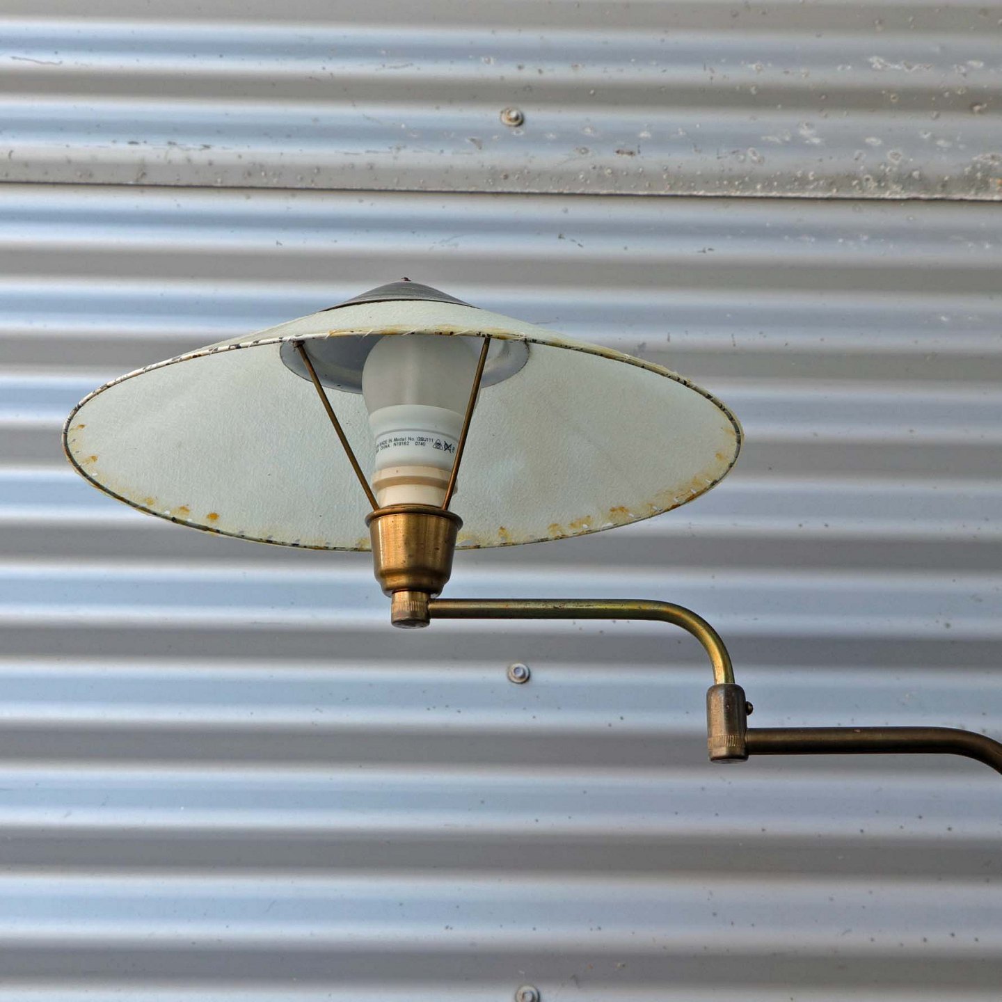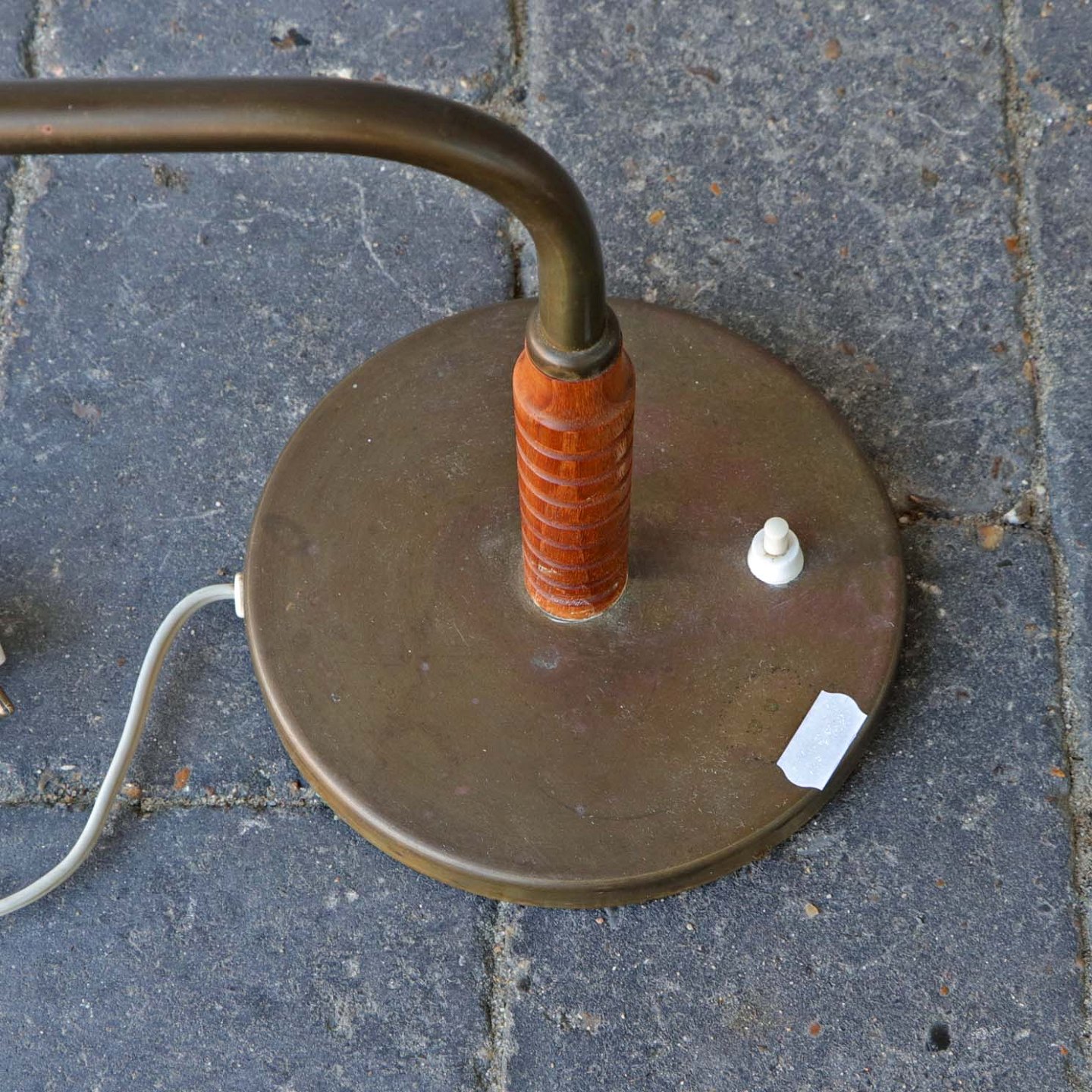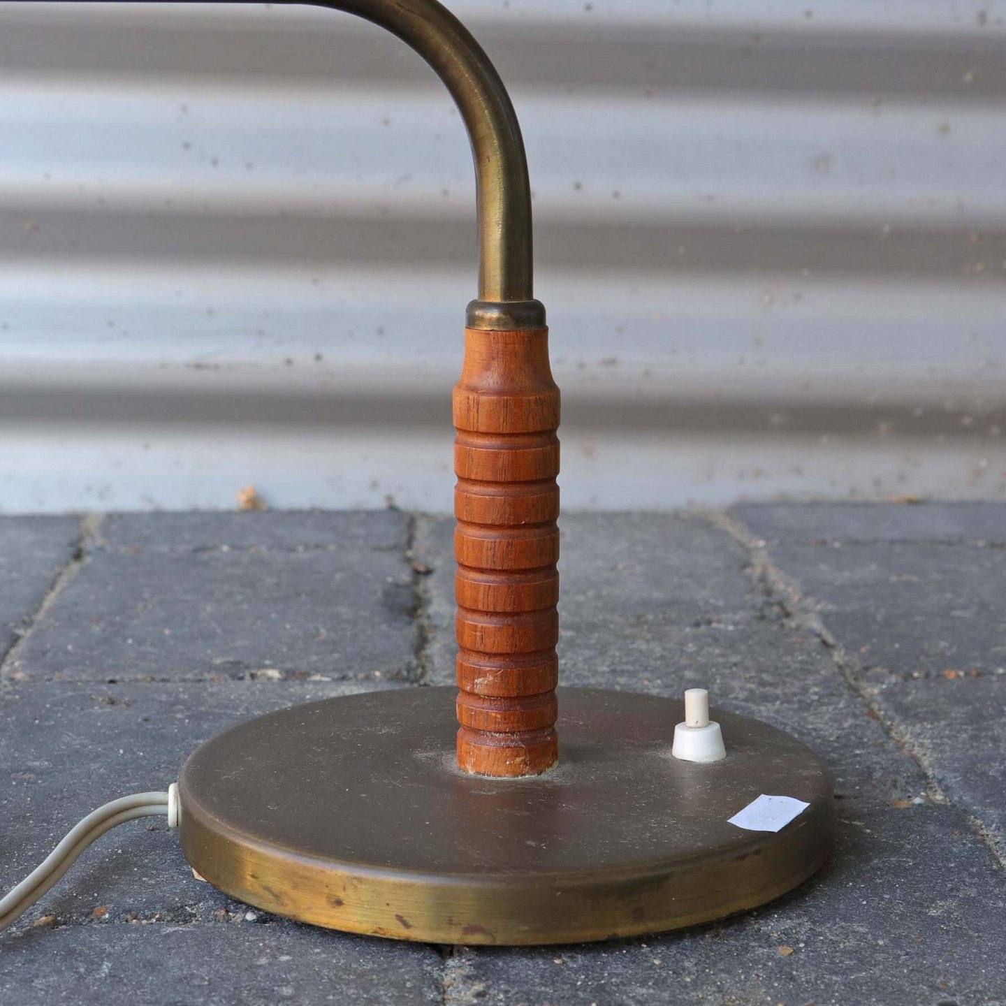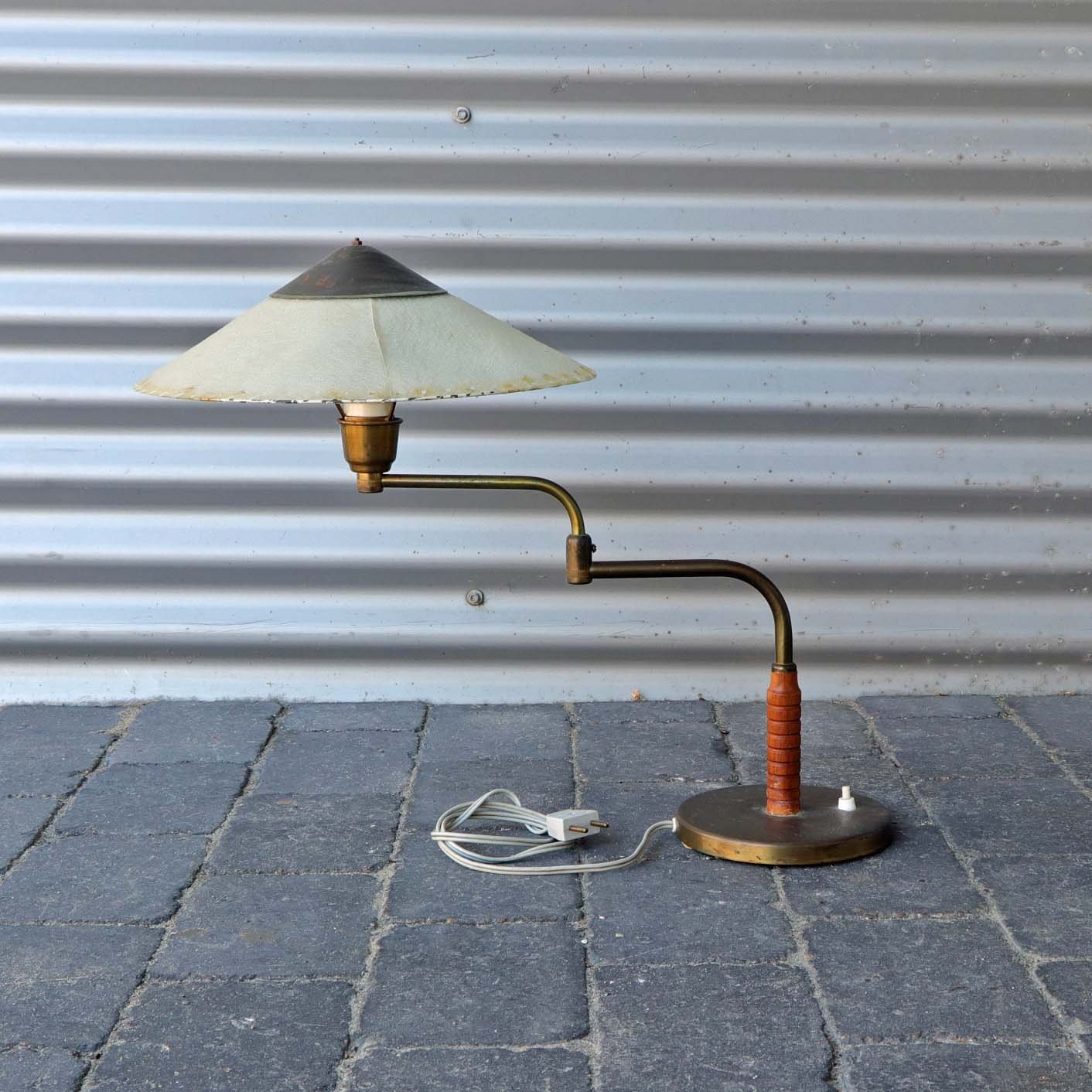 Messing bordlampe med patina. Lampen har svingarm og står med original skærm lavet af svinehud