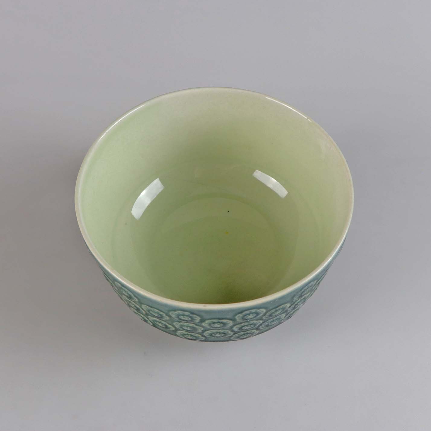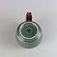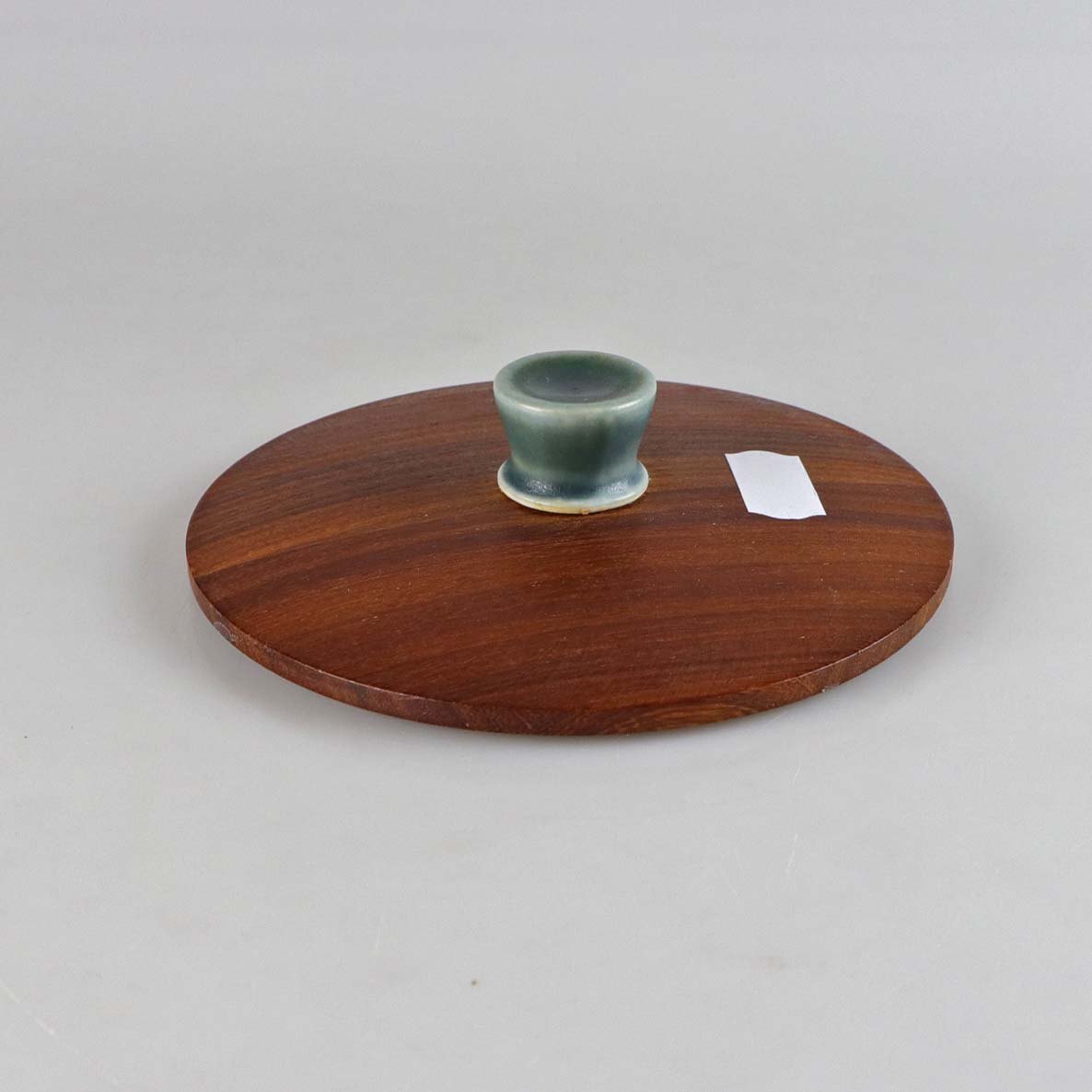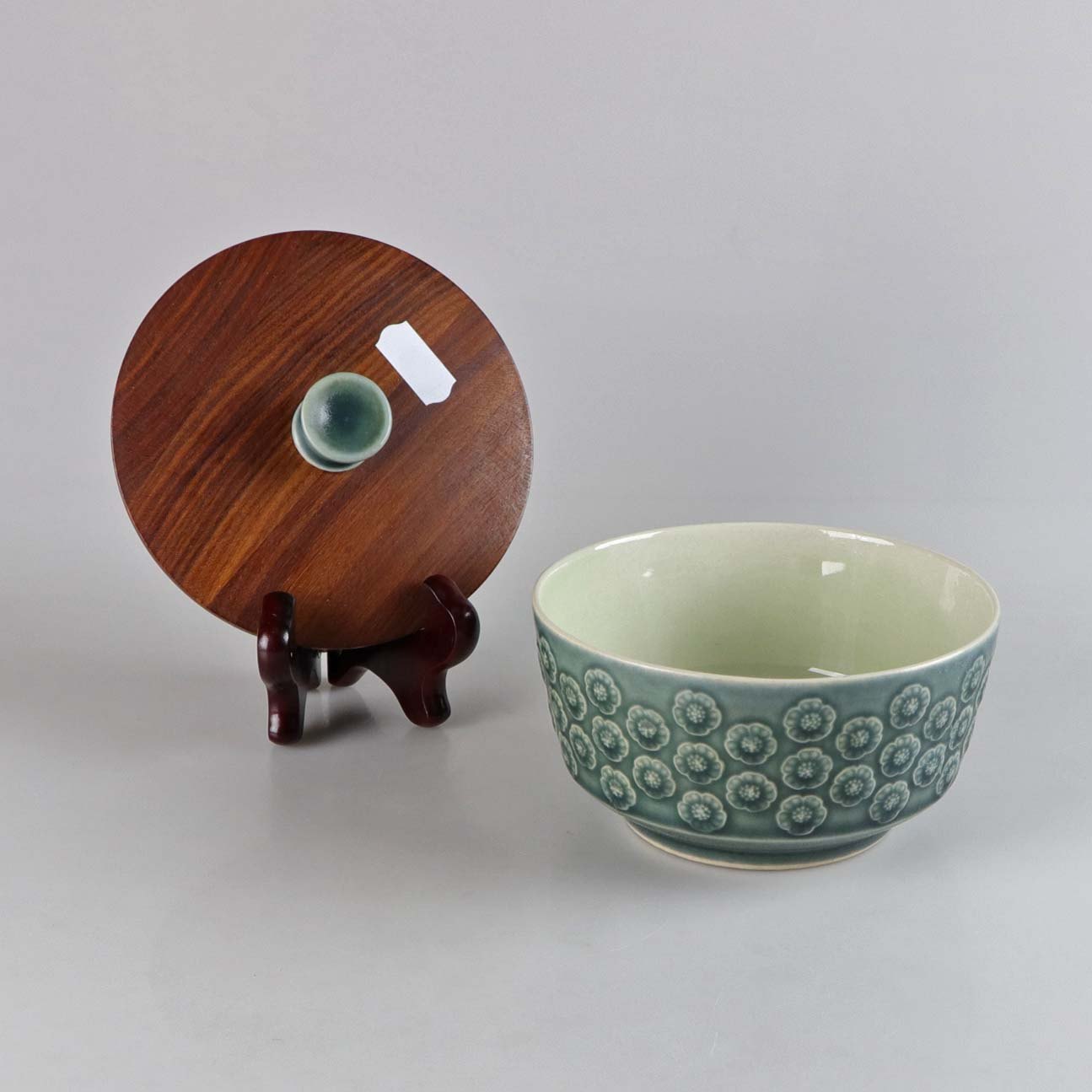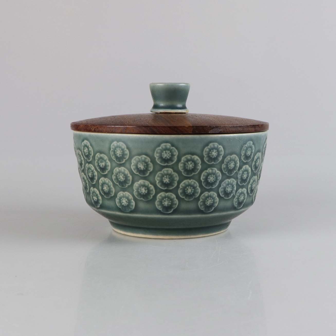 Lågkrukke dekoreret med små blomster og med låg af teaktræ