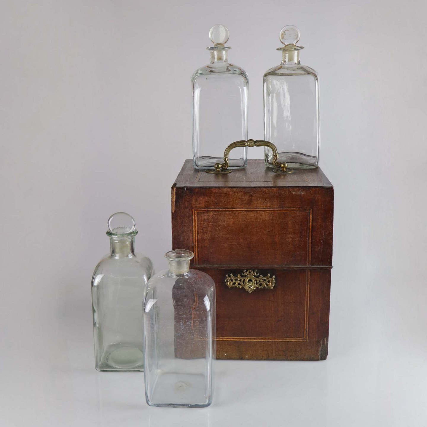 Tantalus med plads til 4 karafler. Skrinet er af lakeret træ med messing håndtag og lås og er foret med stof