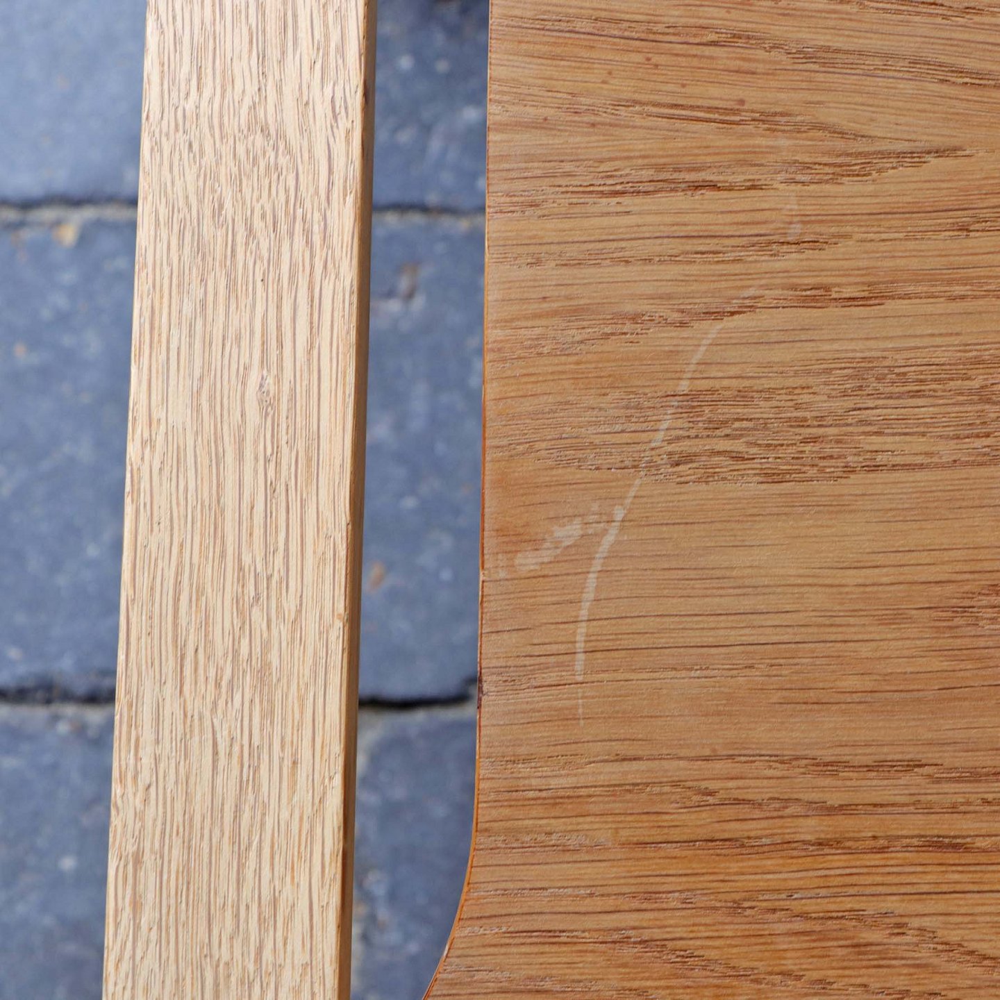 Stel i mat lakeret egetræ og hynder med beigefarvet læder
